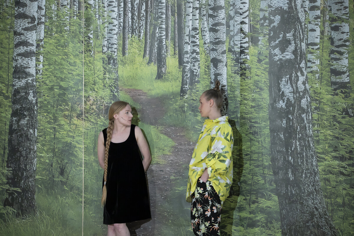 В начале действа висят фотообои с пейзажами берёзовой рощи, на фоне которых стоит Тихон с аккордеоном в руках. Кажется, что режиссёр переносит нас в тот самый городок Калинов на Волге, и сейчас мы услышим «сударыня», громогласные частушки и драматичные монологи с заламываниями рук на груди. Но постановщик Меленчев окунает в реальный мир, перед нами герои в современной одежде: рубашки и платья с рисунками, кеды и шорты. Они так же, как и герои Островского обсуждают «волю», «неволю» и «почему люди не летают как птицы». Но всё это на доступном, современном языке.