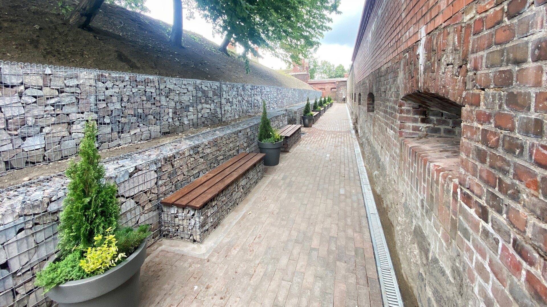 Теперь в воротах отремонтировали крышу и провели гидроизоляцию, чтобы защитить сооружение от влаги. Внутри установили принудительную вентиляцию, которая обеспечит правильный воздухообмен и поможет сохранить кирпичные своды в хорошем состоянии. Кроме того, подрядчик привёл в порядок отмостку парапета.