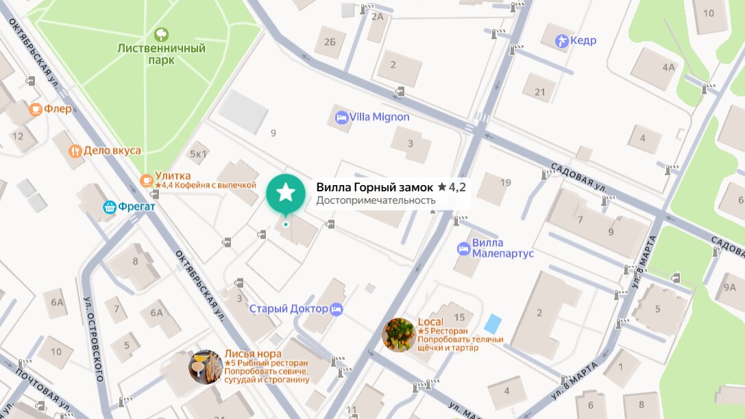 Вилла находится в центре Светлогорска: от неё рукой подать до моря, а до Лиственничного парка ещё ближе. Дом стоит по соседству с мельницей и памятником академику Ивану Павлову.