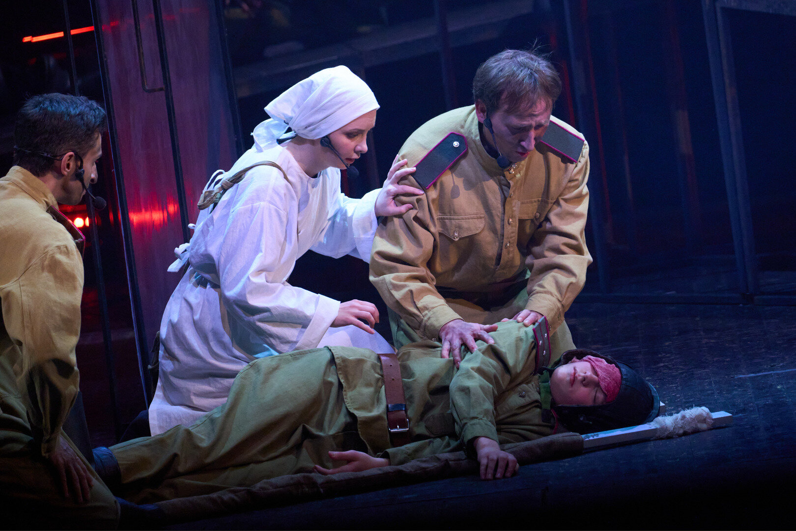 Скрепляет воедино эпизоды удивительно целостное обрамление всего происходящего на сцене. Декорации максимально лаконичны: один и тот же уголок, стол и пара стульев видятся то командирским кабинетом, то уютной комнаткой, то вагонным купе.