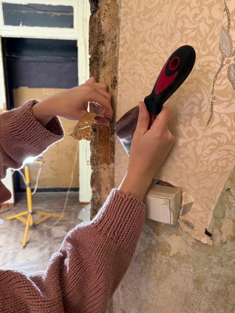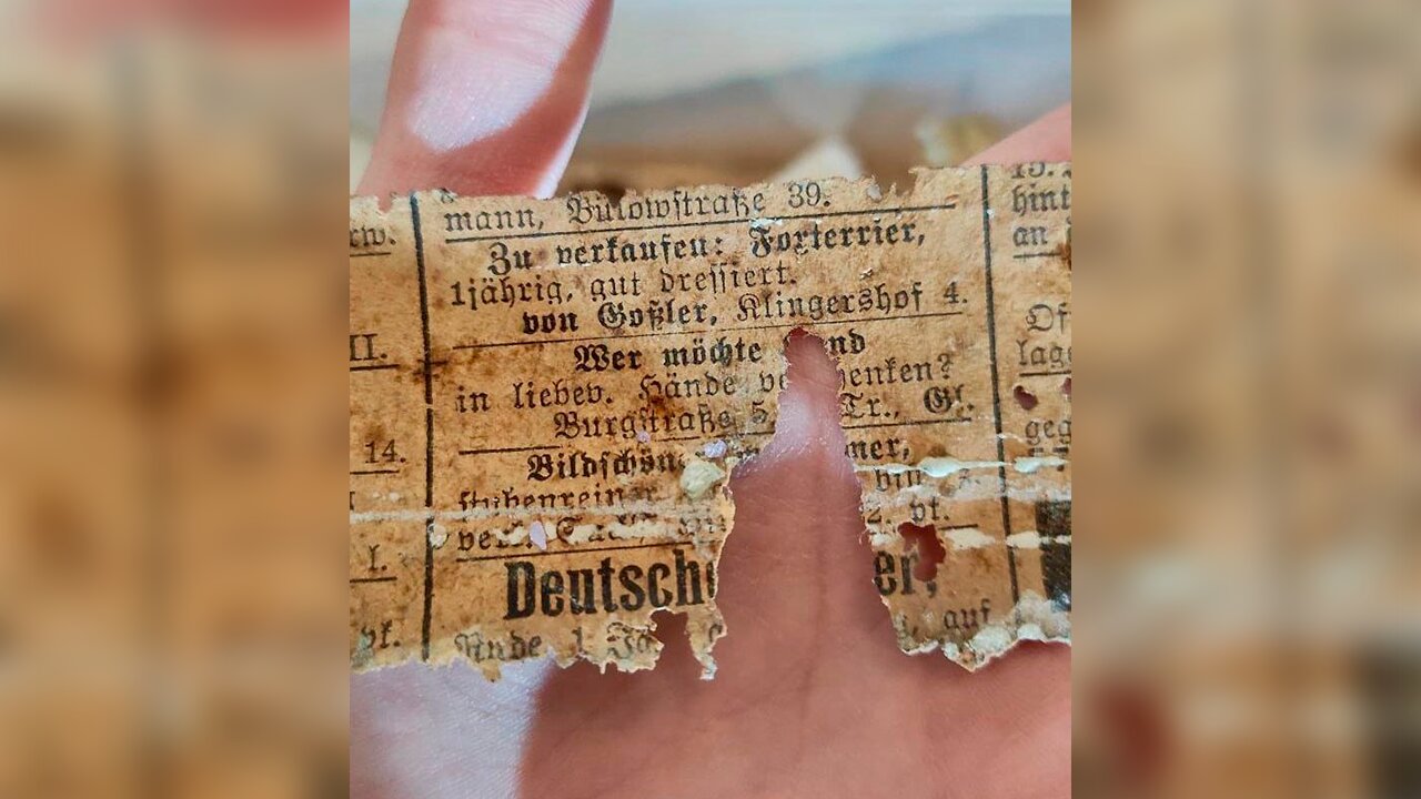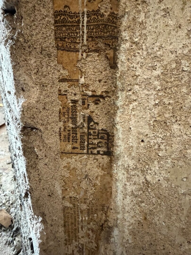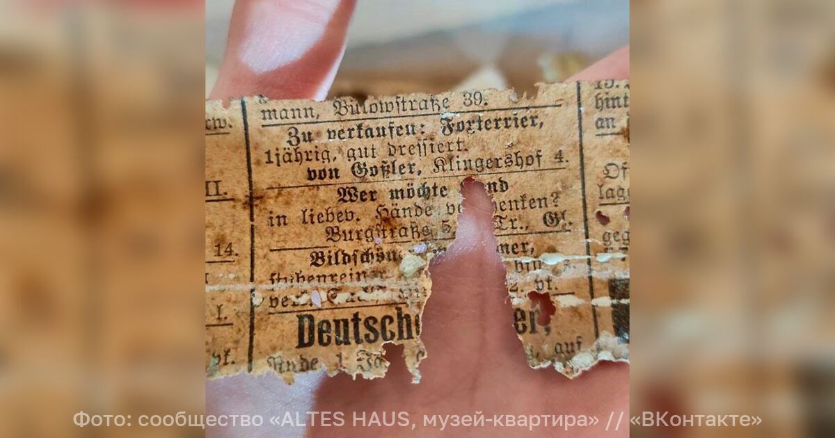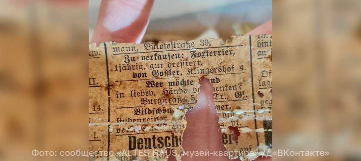 Сейчас в помещении идёт ремонт, сотрудники вскрывают двери и наличники. Под одним из них нашлась старинная немецкая газета — не редкость для калининградских домов.
