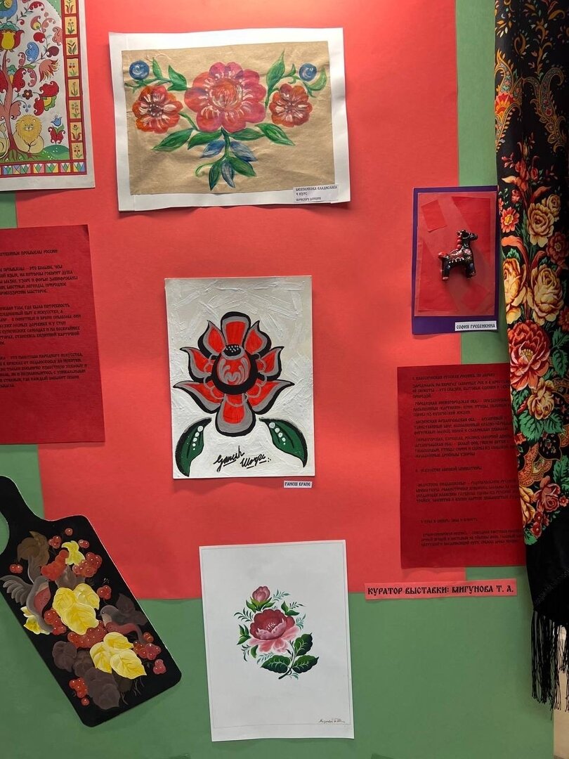 Отдельное внимание организаторы выставки уделили городецкой росписи с её насыщенными цветами и жанровыми сценами. Не забыли и про русские платки, знаменитые своими цветами и мастерством рисунка.