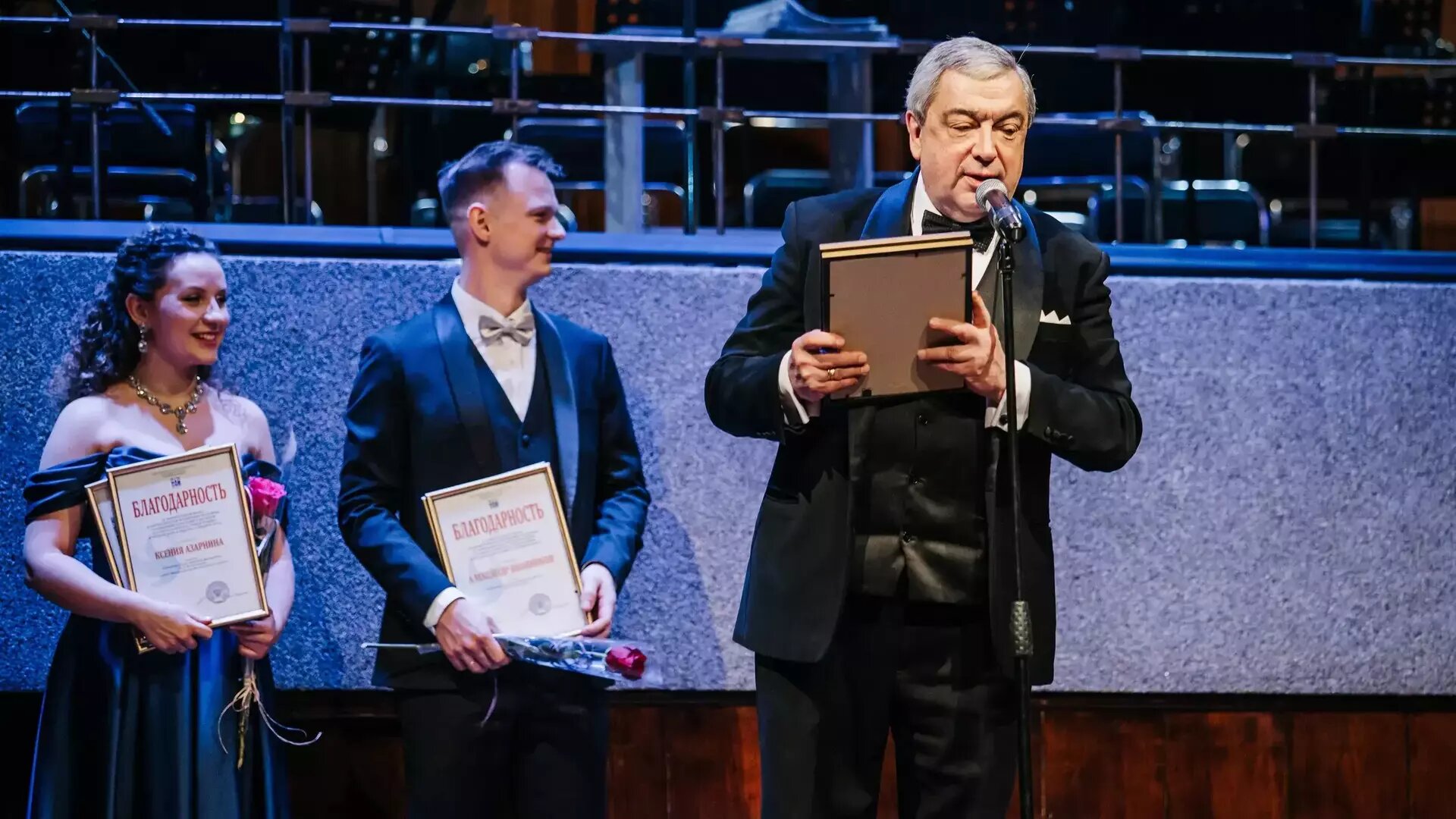 Под занавес он вручает почётные грамоты от министерства по культуре и туризму области Ксении Азарниной, Александру Иванникову и Максиму Кузнецову.