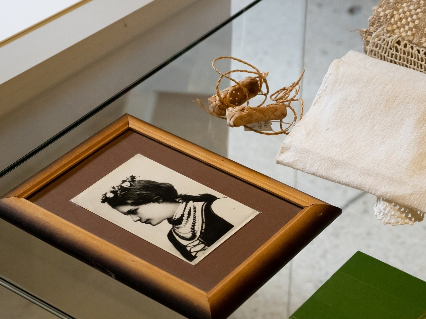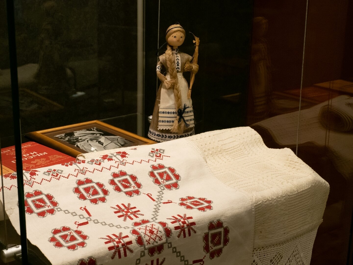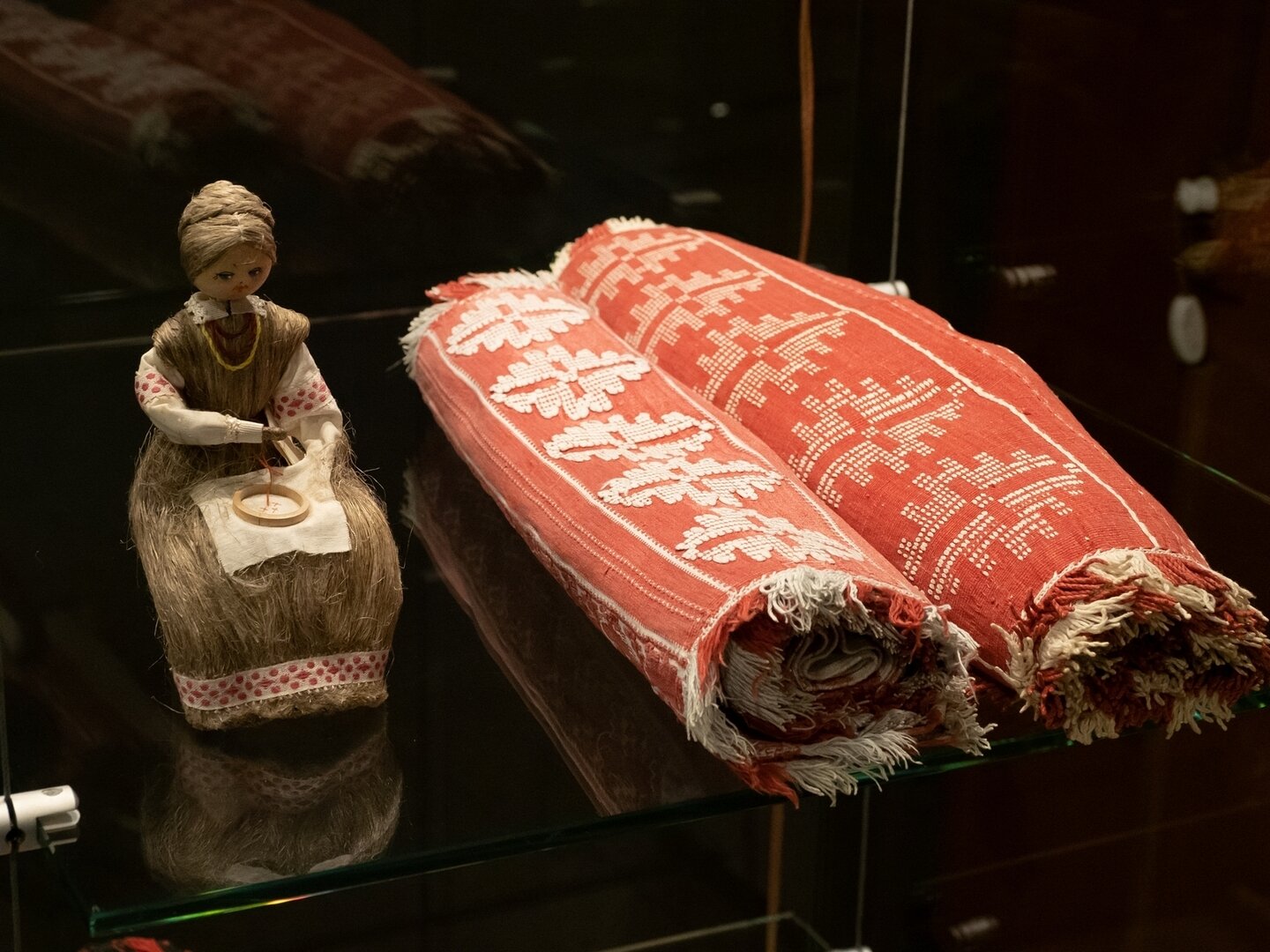В витринах представлены предметы традиционного декоративно-прикладного искусства: тканые покрывала, скатерти, элементы национального костюма и предметы быта.