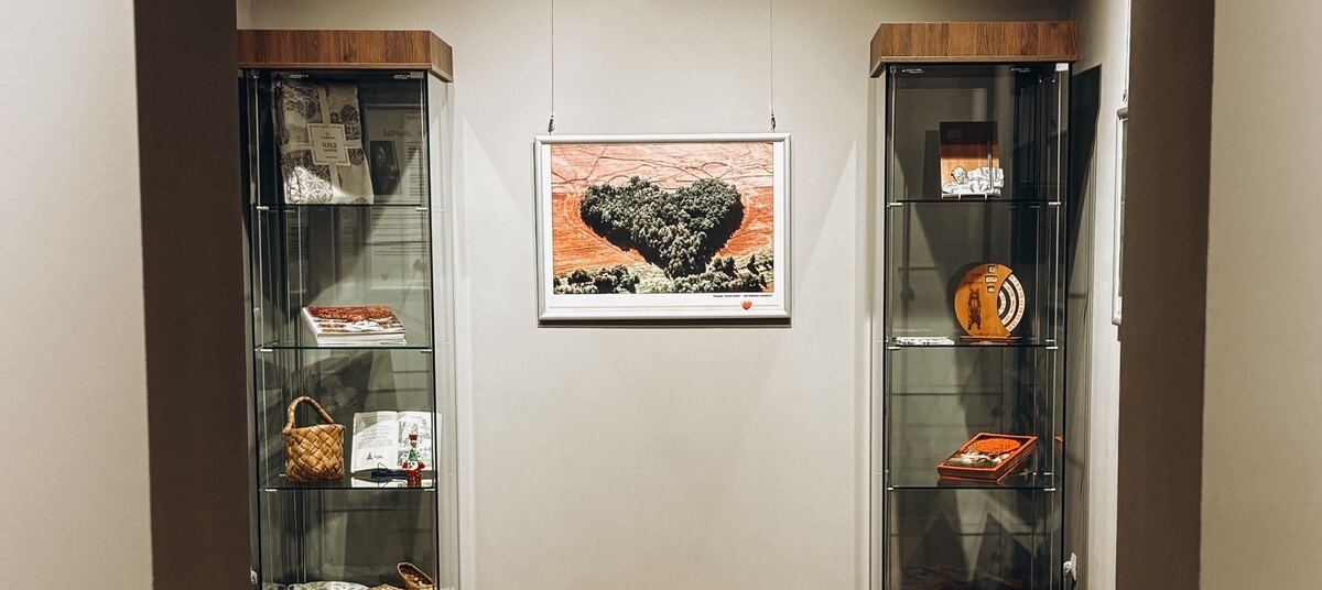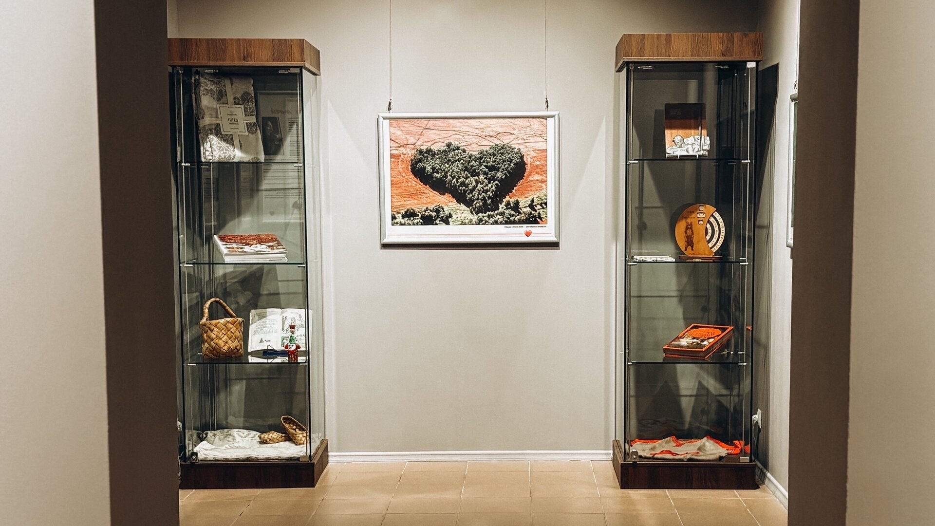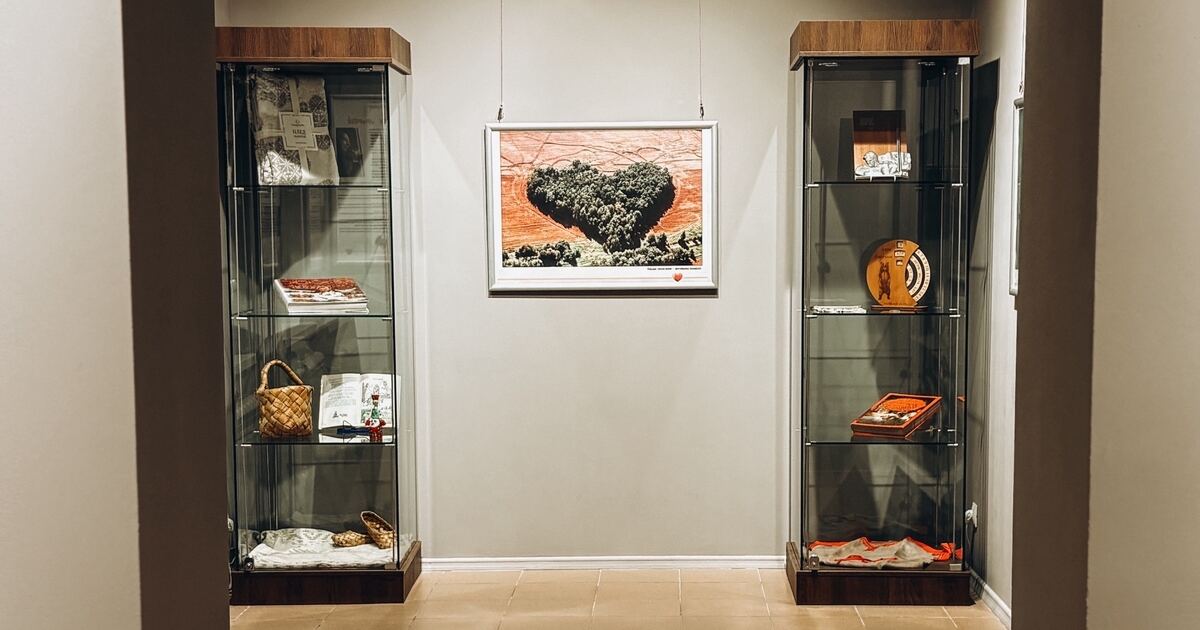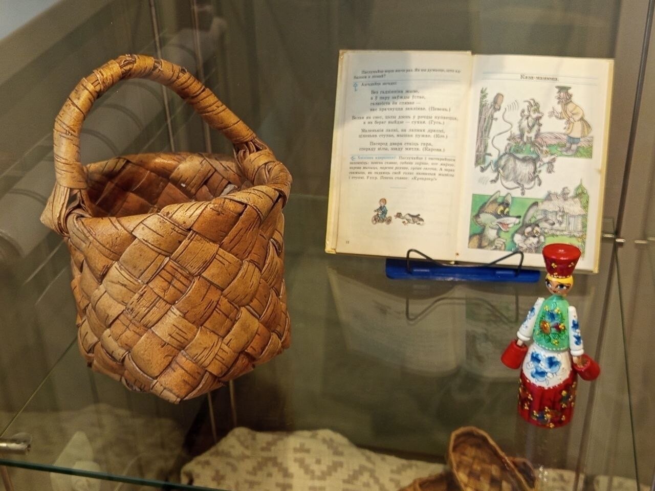 Выставка не ограничивается фотографиями: в витринах представлены сувениры и предметы, связанные с культурой Беларуси. Здесь можно увидеть плетение из бересты, изделия из дерева, а также знаменитый лён и книги.
