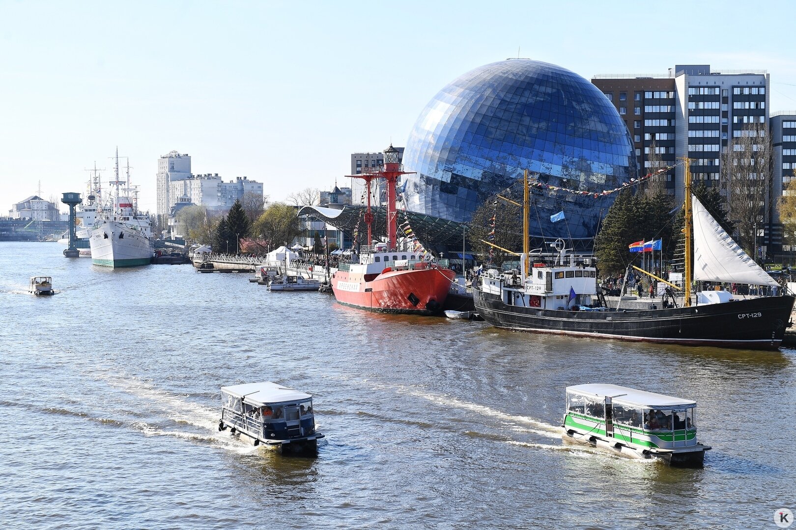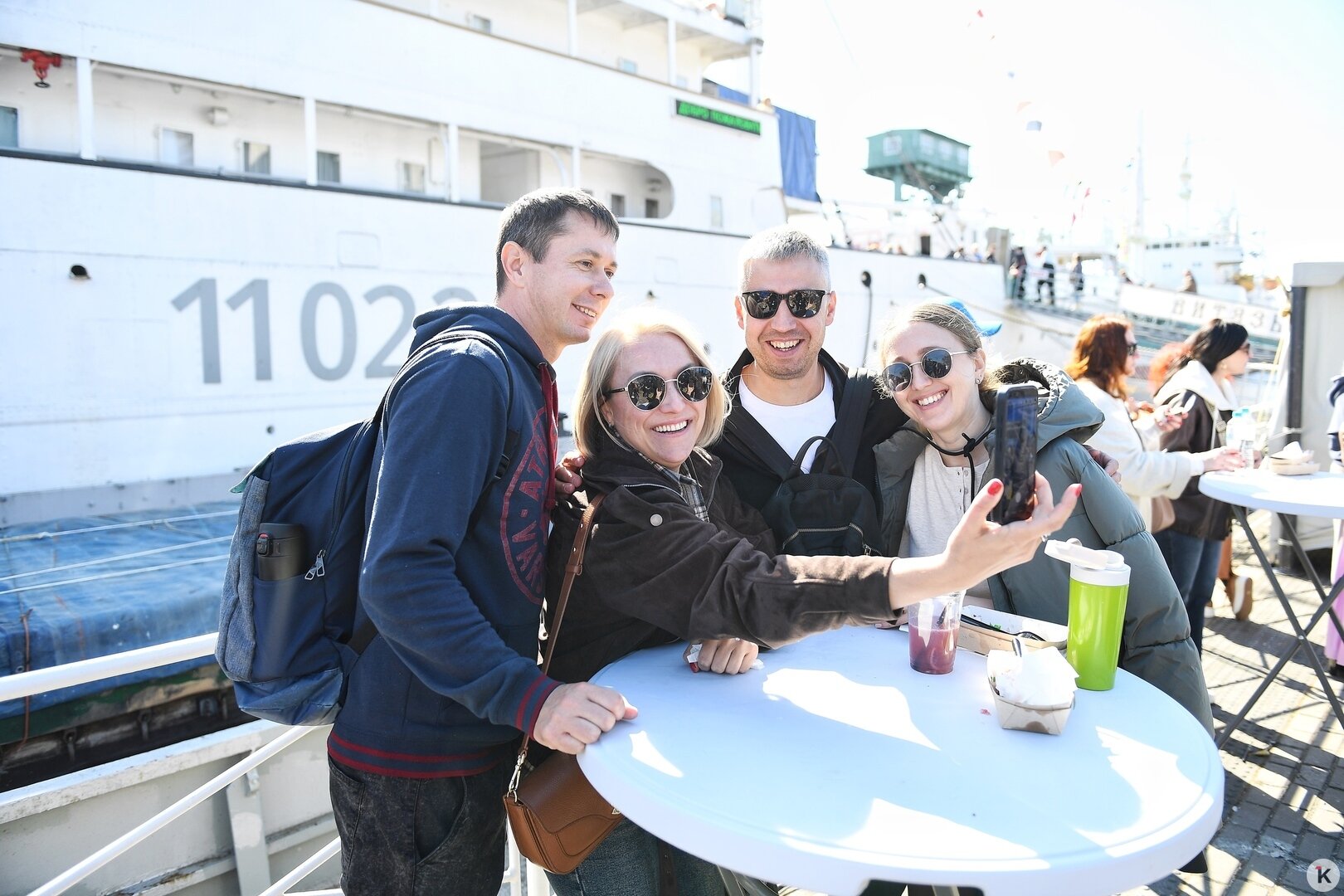 «Дню селёдки» вообще повезло с погодой: на набережной тепло, и гуляющие постепенно снимают куртки и толстовки. В толпе то и дело мелькают тёмные очки: в них удобнее любоваться фотовыставкой, посвящённой красотам Калининградской области и блестящими бортами пришвартованных у набережной судов.