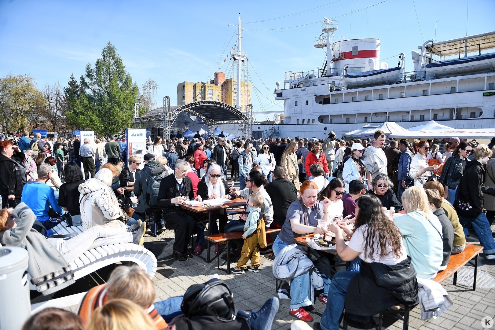 Набережная Музея Мирового океана днём в субботу, 18 апреля, не просто заполнена — она движется. Поток людей тянется вдоль воды, упирается в очереди и снова распадается на ручейки. Так проходит 21-й «День селёдки» — праздник, который за двадцать лет стал одним из самых массовых городских событий.