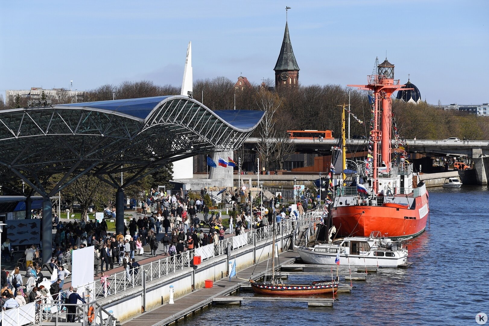 Завершив прогулку, многие выбирают прогуляться до недавно открывшегося Философского моста. Возле него большая очередь, но желание поскорее оказаться на острове Канта перевешивает.