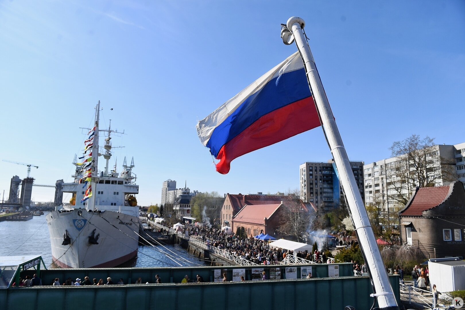 Свободного пространства перед сценой почти нет: люди стоят вплотную, а опоздавшие слушают издалека. Вскоре над водой разносится музыка: это поздравление от артистов Калининградской областной филармонии.