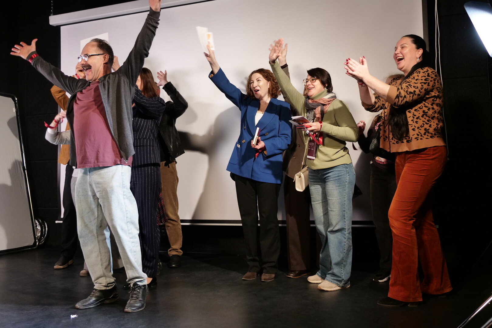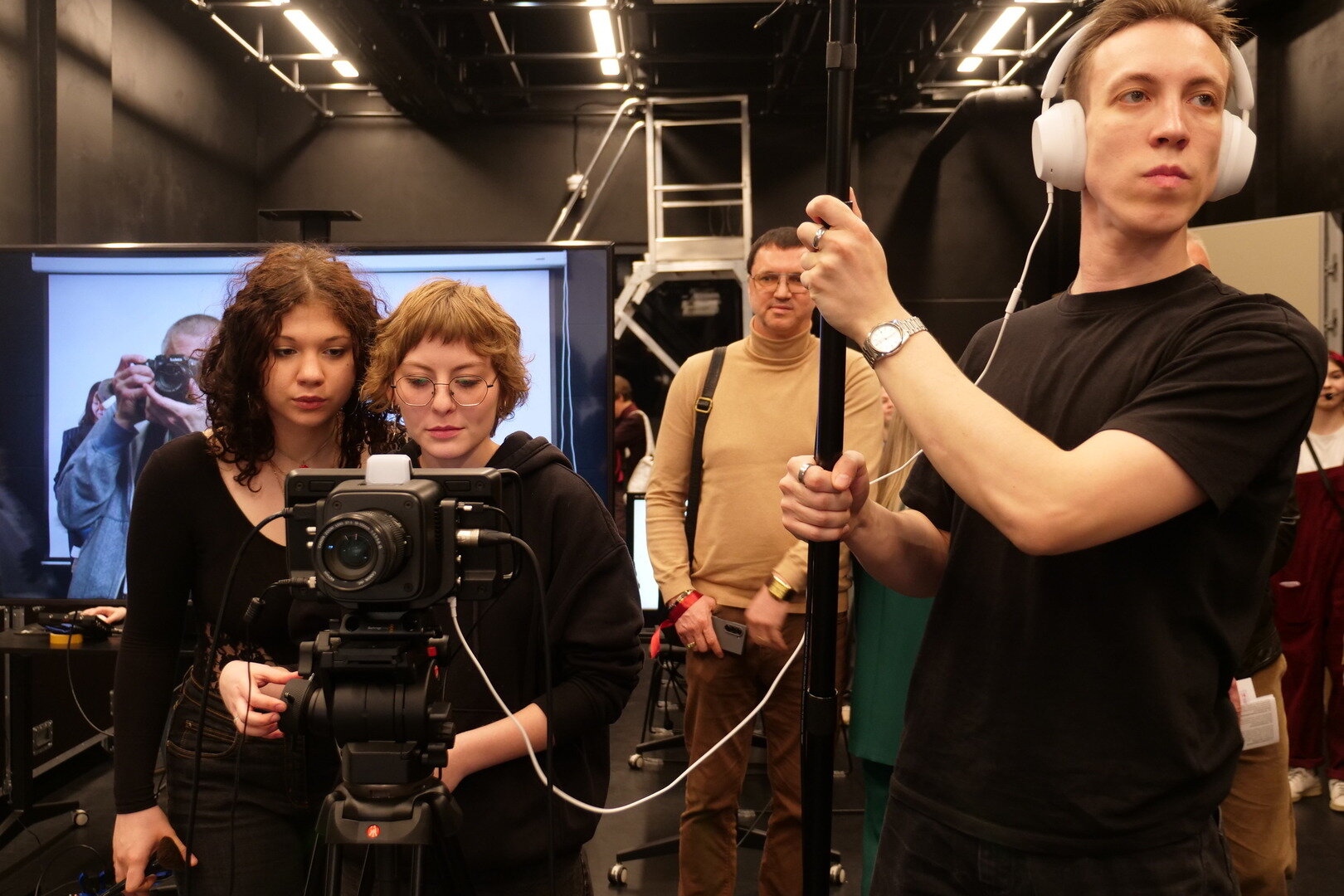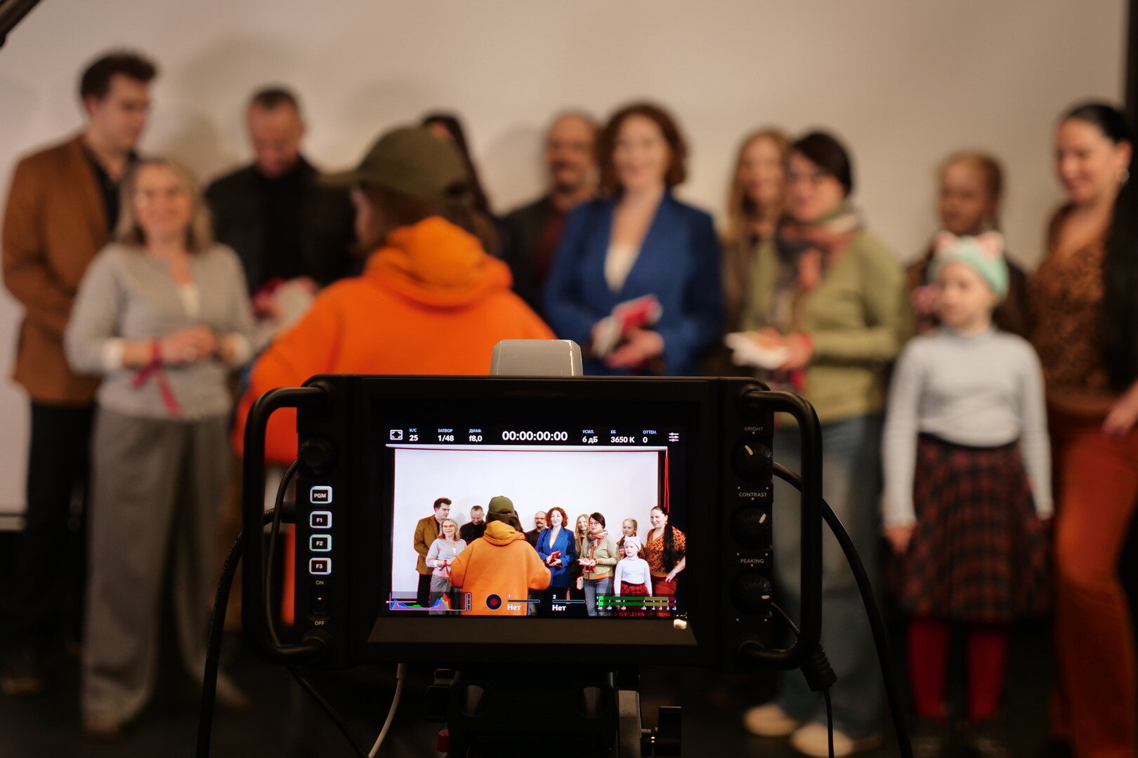 Всё происходит по-настоящему: есть микрофоны, камеры и даже хлопушка с номером дубля. Режиссёр тоже не церемонится, давая указания — перед ним сейчас не зрители, а подчинённые. Впрочем, никто не в обиде: «фанаты» в деловых костюмах хлопают, подпрыгивают и даже свистят — не каждый день доведётся почувствовать себя артистом.