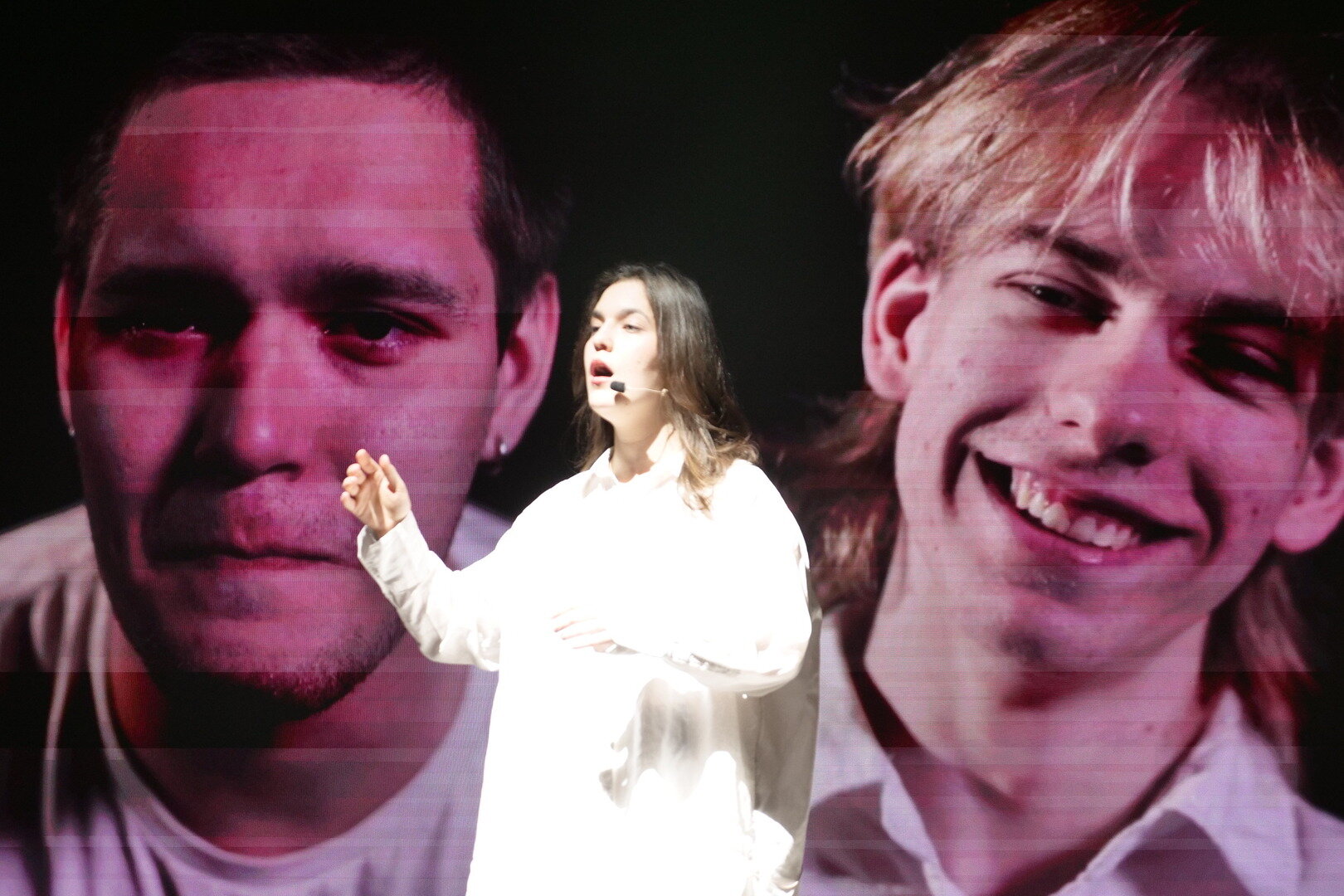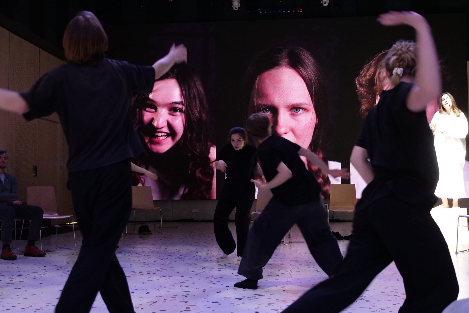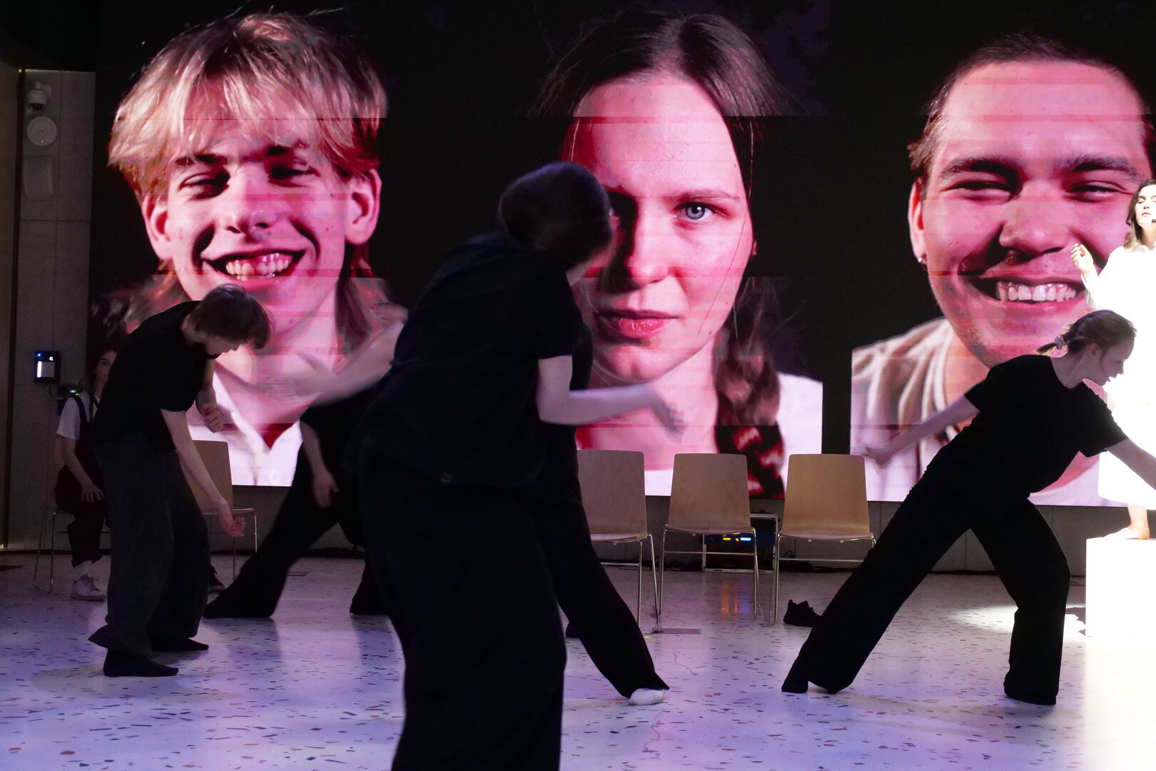 Это молодые актёры, которых записали на видео такие же начинающие операторы. Впрочем, некоторые артисты присутствуют в зале во плоти: они танцуют между стульями, демонстрируя свои таланты в области пластики и хореографии.