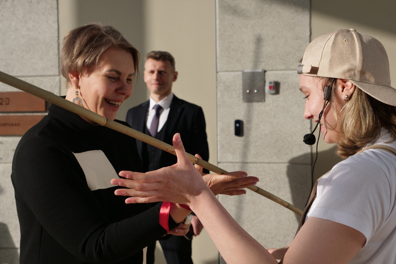 Когда выступление заканчивается, гостям тут же предлагают попробовать свои силы. Поначалу многие стесняются, но вскоре уже почти все с интересом балансируют палки на открытых ладонях.  И — внезапно — удостаиваются аплодисментов от гуляющих снаружи корпуса прохожих. Случайность это или тоже элемент постановки? Теперь трудно разобрать — да это и неважно.