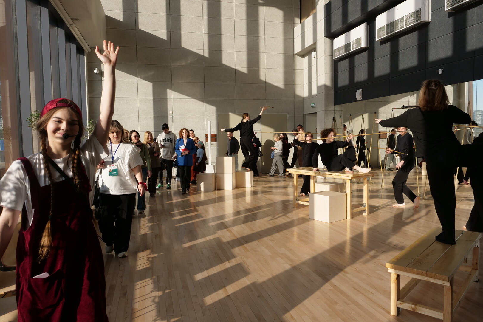 Это важно для понимания происходящего: зрителям показывают не просто экскурсию, но и своеобразную выставку достижений. Для артистов такой формат волнителен вдвойне, ведь каждый номер для них — как экзамен. Только принимают его не знакомые преподаватели, а гости Балтийского культурного форума.
