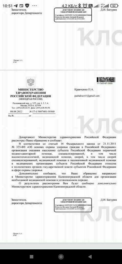 «Ваше обращение направлено в министерство здравоохранения Калининградской области для организации необходимой медицинской помощи в установленном порядке. О результатах рассмотрения вам будет сообщено дополнительно», — ответили в Минздраве 8 августа.