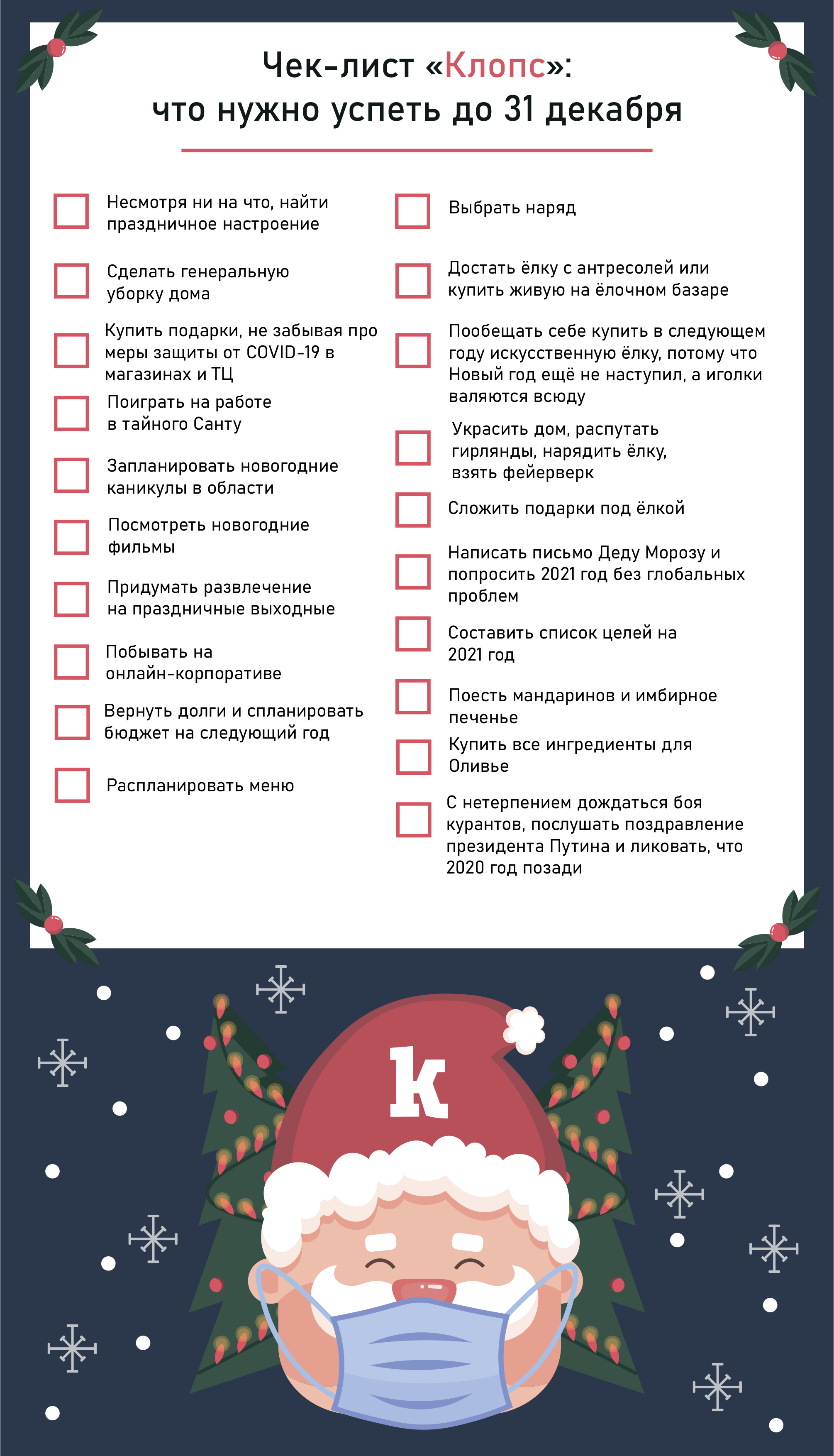 Остался месяц до конца 2020 года. "Клопс" предлагает читателям чек-лист того, что обязательно нужно успеть сделать до Нового года. Сохраните, распечатайте его себе и отмечайте, что уже сделано, а что ещё только в планах.