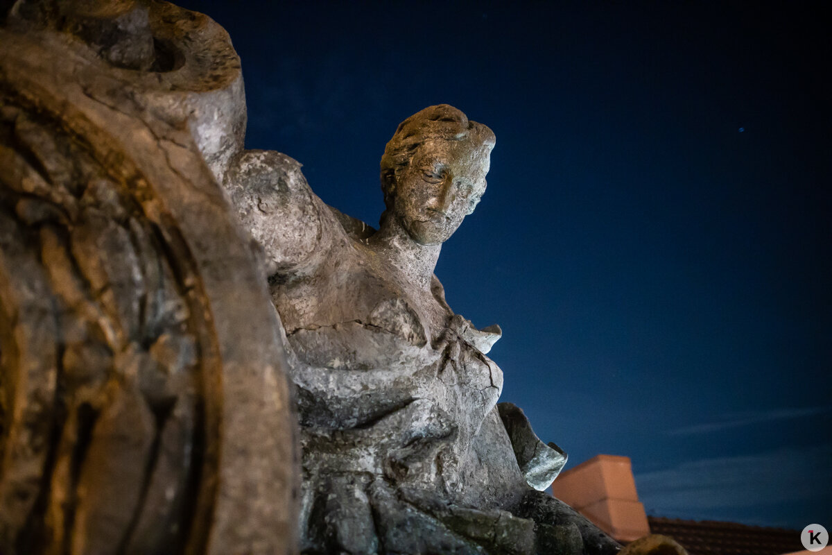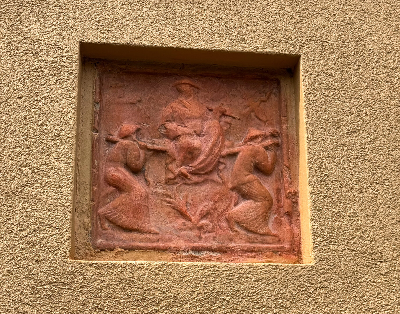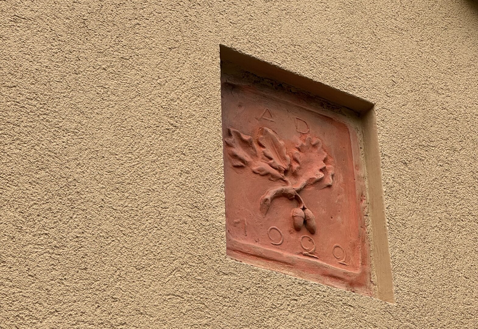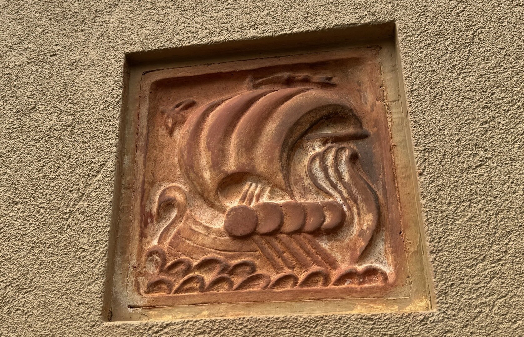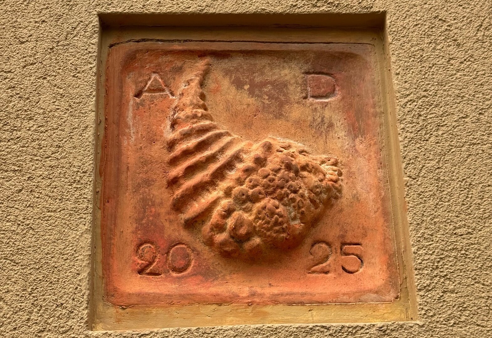 Ещё одну высыпавшуюся полностью хаусмарку, с корабликом, она восстановила по сохранившемуся на основе силуэту. А вот какой была третья — сегодня не знает никто. Так что Наталья, по согласованию с заказчиком, слепила её из своего любимого бетона по собственному эскизу. Изображение рога изобилия художница «по-честному» подписала: «Год 2025 от Рождества Христова».