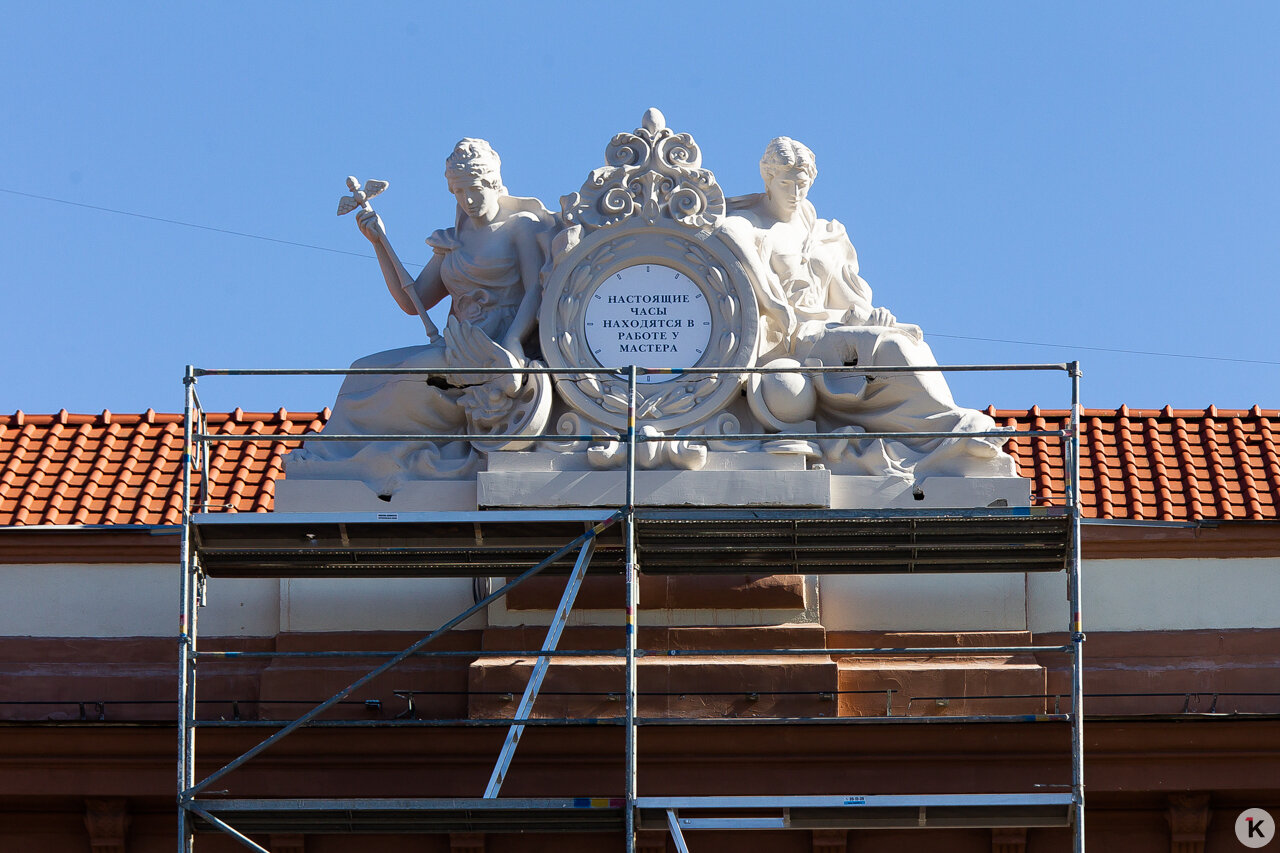 Скульптурная группа представляет собой двух сидящих девушек, опирнающихся на часы. К тому времени она была практически полностью разрушена, лицо одной из фигур и вовсе просто замазали глиной. В 2021 году по сохранившимся фотографиям в областном фонде капремонта сделали 3D-модель. Отлить по ней копию акротерия поручили местному мастеру.