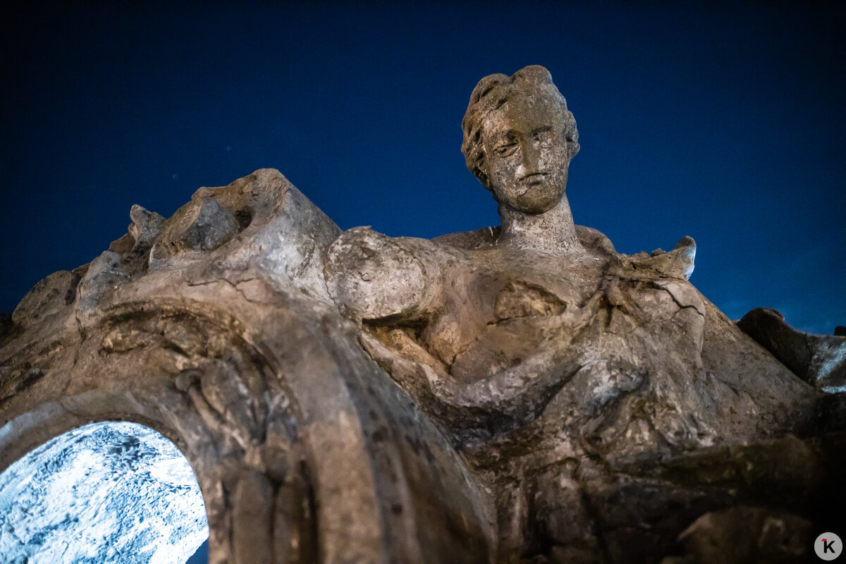 Техническое решение было простым и изящным: неудачную бетонную болванку скульптор использовала как основу, поверх неё создавая собственную скульптуру, «как коросту», корректируя брак складками ткани и декоративными деталями.