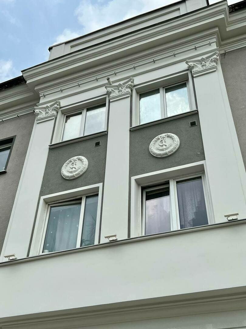 Подрядчик восстановил на фасаде исторические барельефы, изображающие якоря. Дом довоенный, а их сделали уже в период СССР в честь переселенцев-моряков.