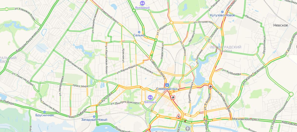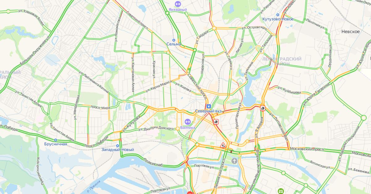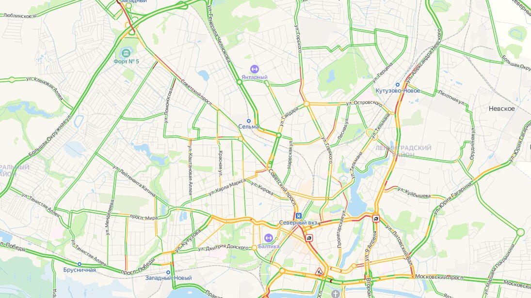 Движение затруднено на Советском проспекте от остановки «Аэродром» до перекрёстка с Северным обходом. Также пробки сформировались в районе сквера «Первым поселенцам Калининграда», у Двухъярусного моста и на Ленпроспекте (от гостиницы «Калининград» до «Европы»). Автомобилисты сообщают о двух ДТП: рядом с памятником «Мать-Россия» и остановкой «Улица 9 Апреля».