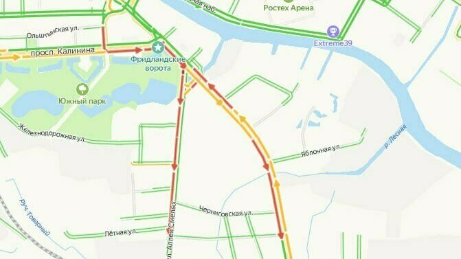 По данным сервиса «Яндекс.Карты», пробка тянется от Фридландских ворот до Московского рынка. «Красным» также отмечены прилегающие участки Аллеи Смелых и проспекта Калинина.
