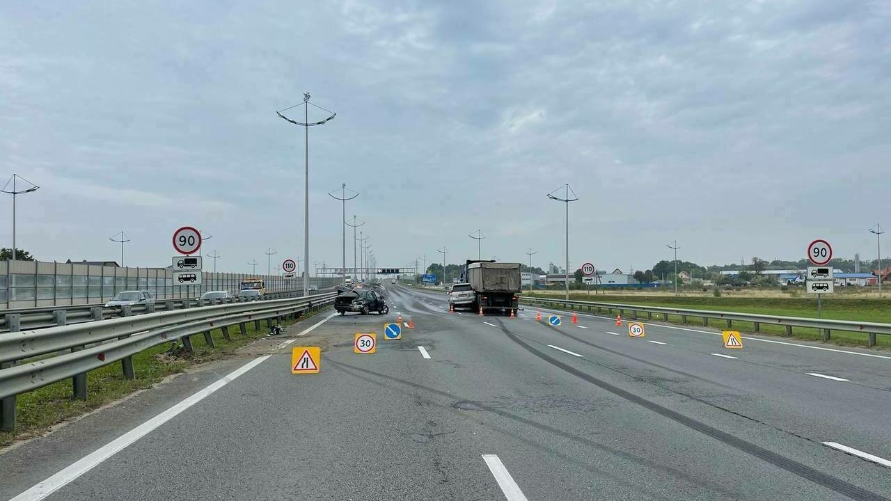 Авария случилась накануне утром. DAF с полуприцепом при перестроении вправо не уступил дорогу едущему попутно автомобилю Opel. Водителям 57 и 55 лет соответственно.