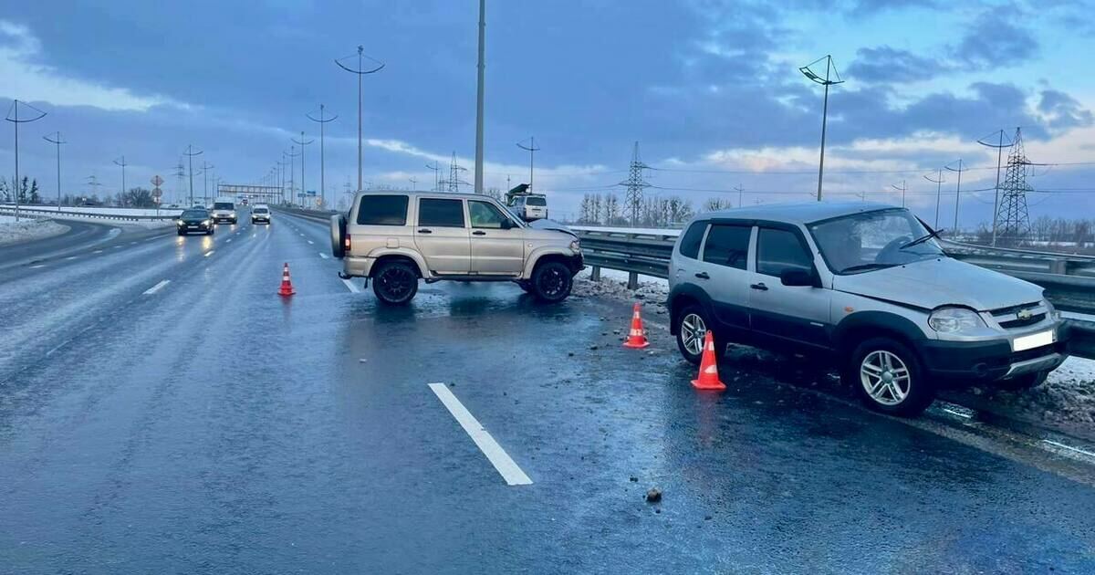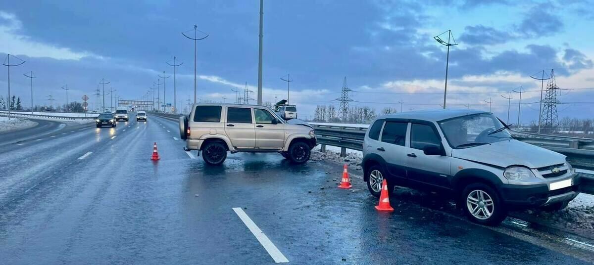 На окружной кроссовер Chevrolet Niva на скользкой дороге врезался во внедорожник «УАЗ» и впечатался в отбойник. Об этом сообщает пресс-служба регионального УМВД.