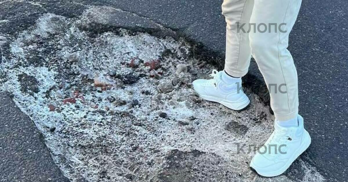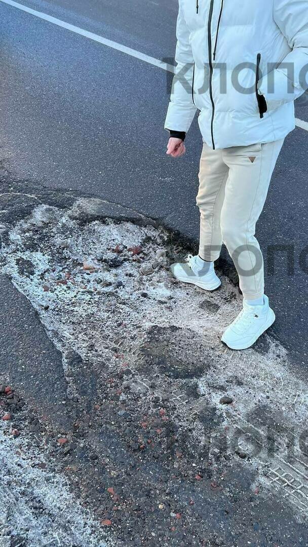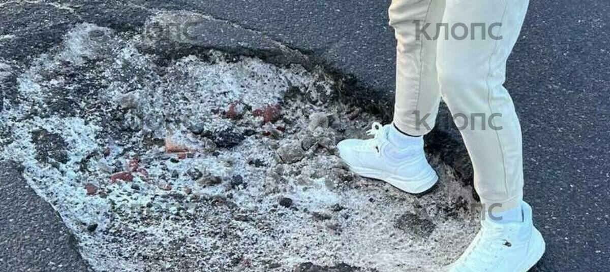 По словам людей, прямо у пешеходного перехода в районе дома № 28 у обочины разбита дорога. Чтобы проехать без последствий для авто, нужно выезжать на встречную полосу. Один из автомобилистов, кто не стал нарушать правила и уже влетел в яму, показал, что глубина пробоины с кроссовок.