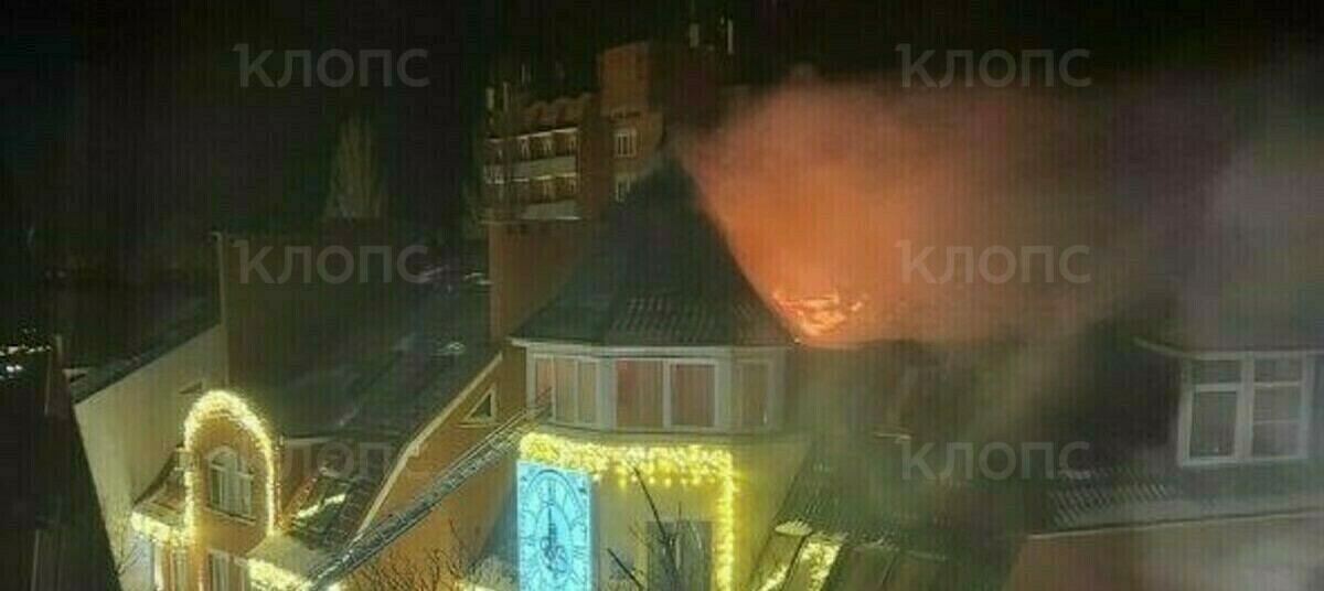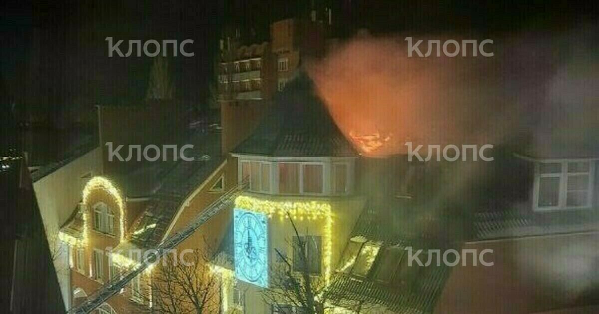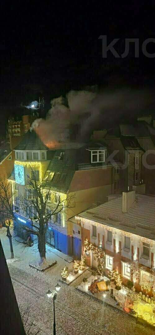 Появилось видео пожара в доме с часами на Курортном проспекте в Зеленоградске. Запись и фото «Клопс» прислал очевидец, житель соседнего здания.