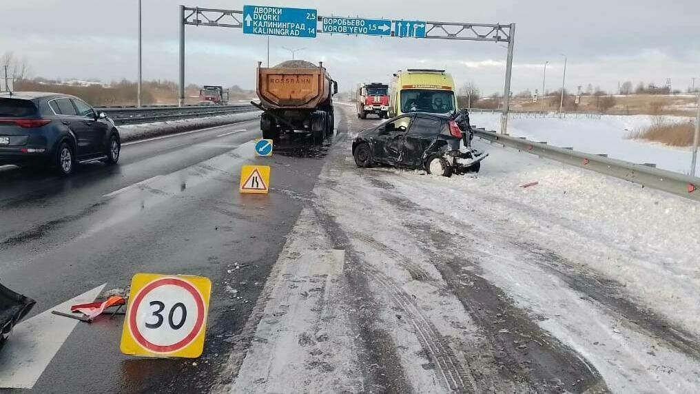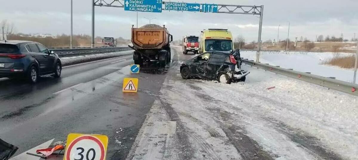 По предварительным данным, авария случилась в пятницу, 19 января, в 11:00 на 21 км 500 м трассы Калининград — Черняховск — Нестеров. Управляя Fiat, 27-летний водитель при перестроении с левой полосы в правую не убедился в безопасности манёвра и создал помеху в движении автомобилю MAN. От столкновения легковушку отбросило на ограждение. Водителя и 26-летнюю пассажирку Fiat госпитализировали с травмами.
