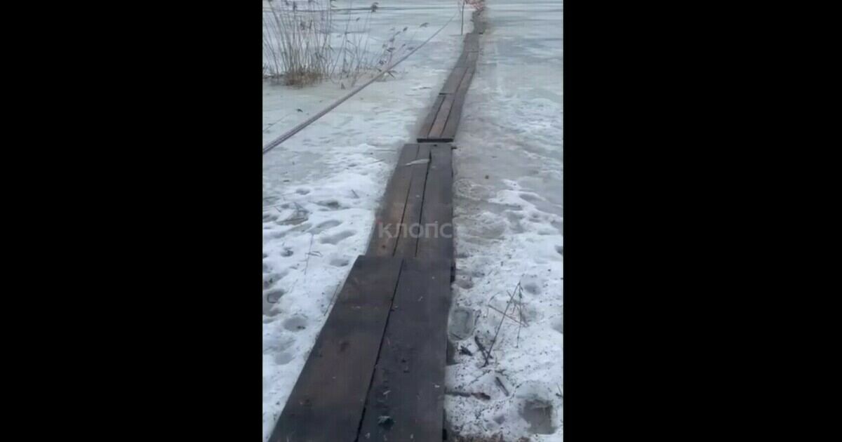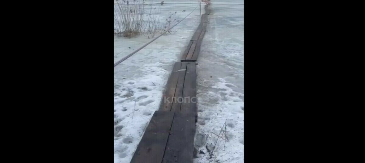 После обрушения понтонного моста «островитяне» из Матросово вынуждены добираться к своим домам по выложенным на льду доскам. Об этом «Клопс» рассказала одна из местных жительниц.