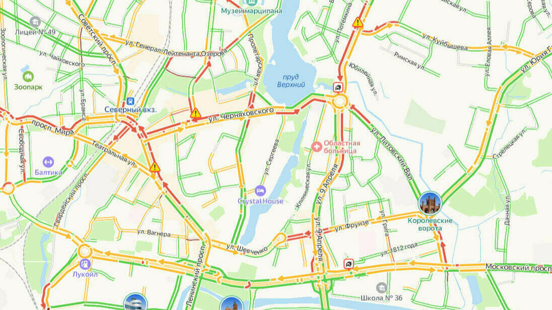 Центр Калининграда днём во вторник, 5 марта, встал в километровых пробках. Об этом говорят данные сервиса «Яндекс. Карты».