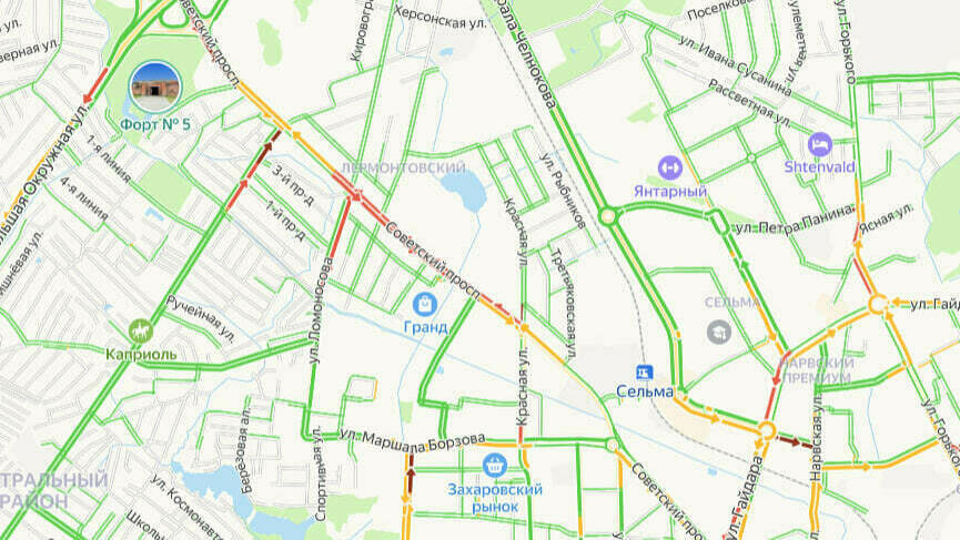 Машины стоят в заторах на Советском проспекте. О ДТП не сообщается. Общая дорожная ситуация в городе оценивается в пять баллов.