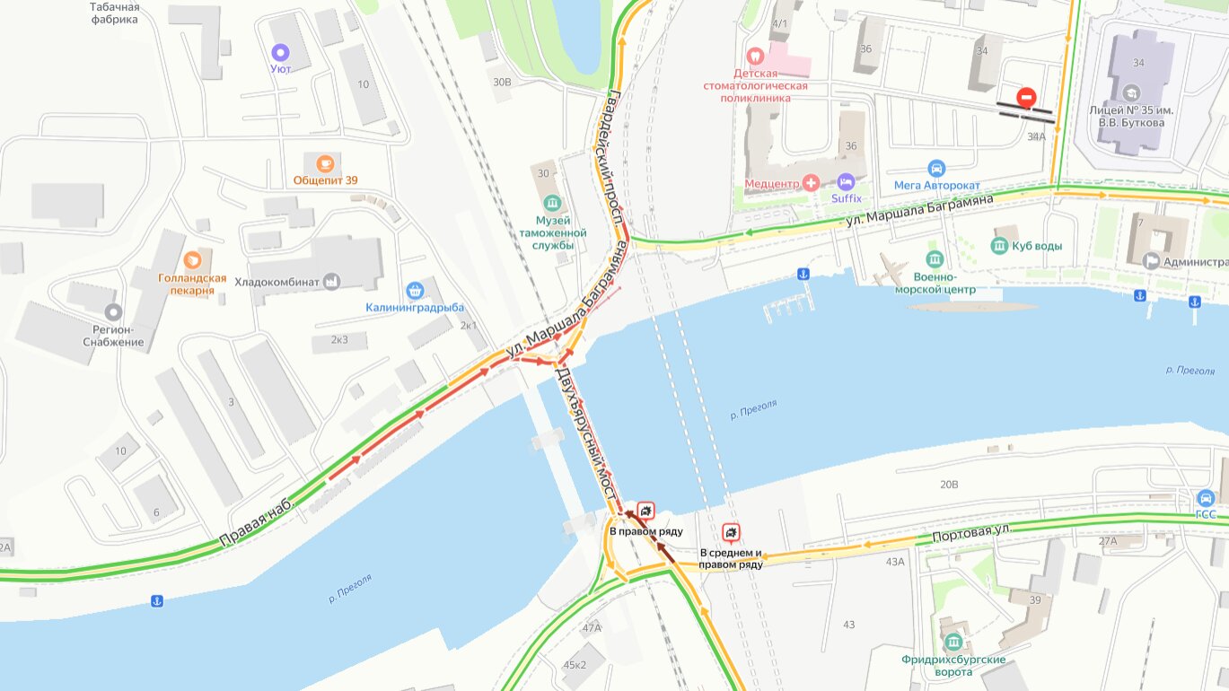 Примерно в 15:00 в правом ряду на улице Железнодорожной на подъезде к мосту столкнулись такси и грузовик «Водоканала». Согласно данным сервиса «Яндекс.Карты», пробка растянулась от пересечения с Портовой улицей до развилки на Правую набережную и улицу Маршала Баграмяна. Кроме того, автомобили стоят на Гвардейском проспекте у музея таможенной службы.