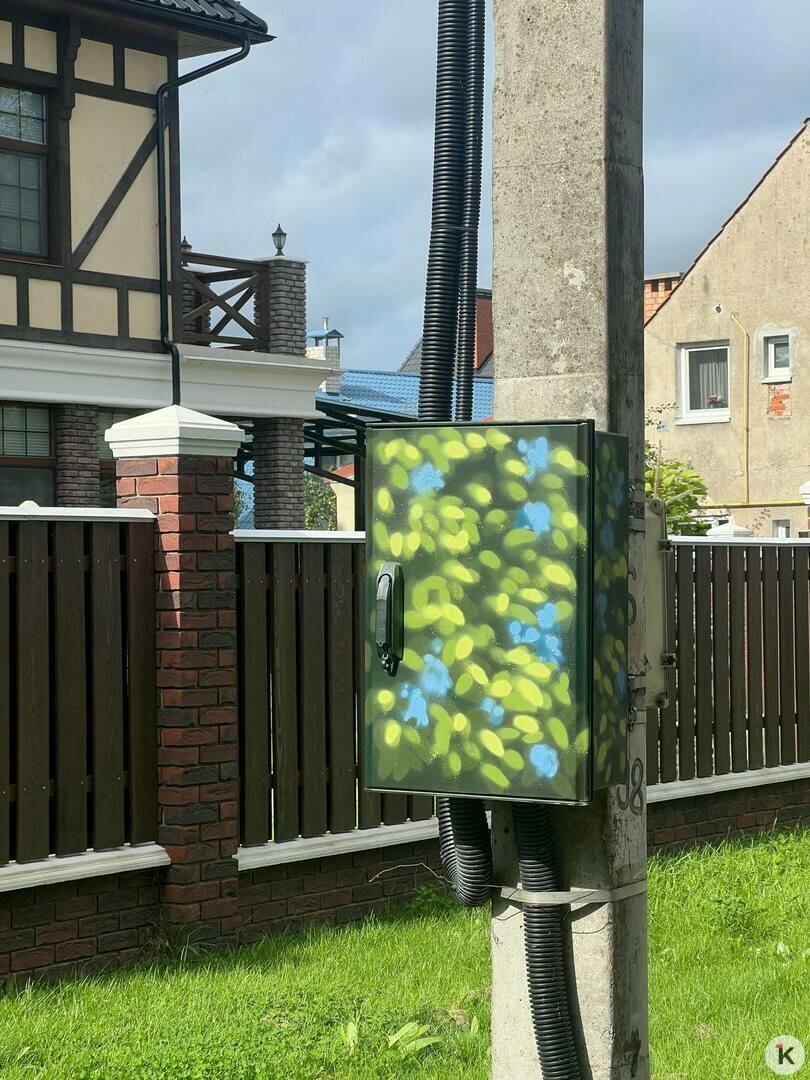 Наконец, четвёртая точка — давно полюбившийся художнику Зеленоградск. Здесь продолжается оформление электрощитовых. Неэстетичные серые ящики Гейнц уже традиционно превращает в сказочные сундучки с расписными стенками, местами делая их практическими незаметными в листве стоящих рядом деревьев.
