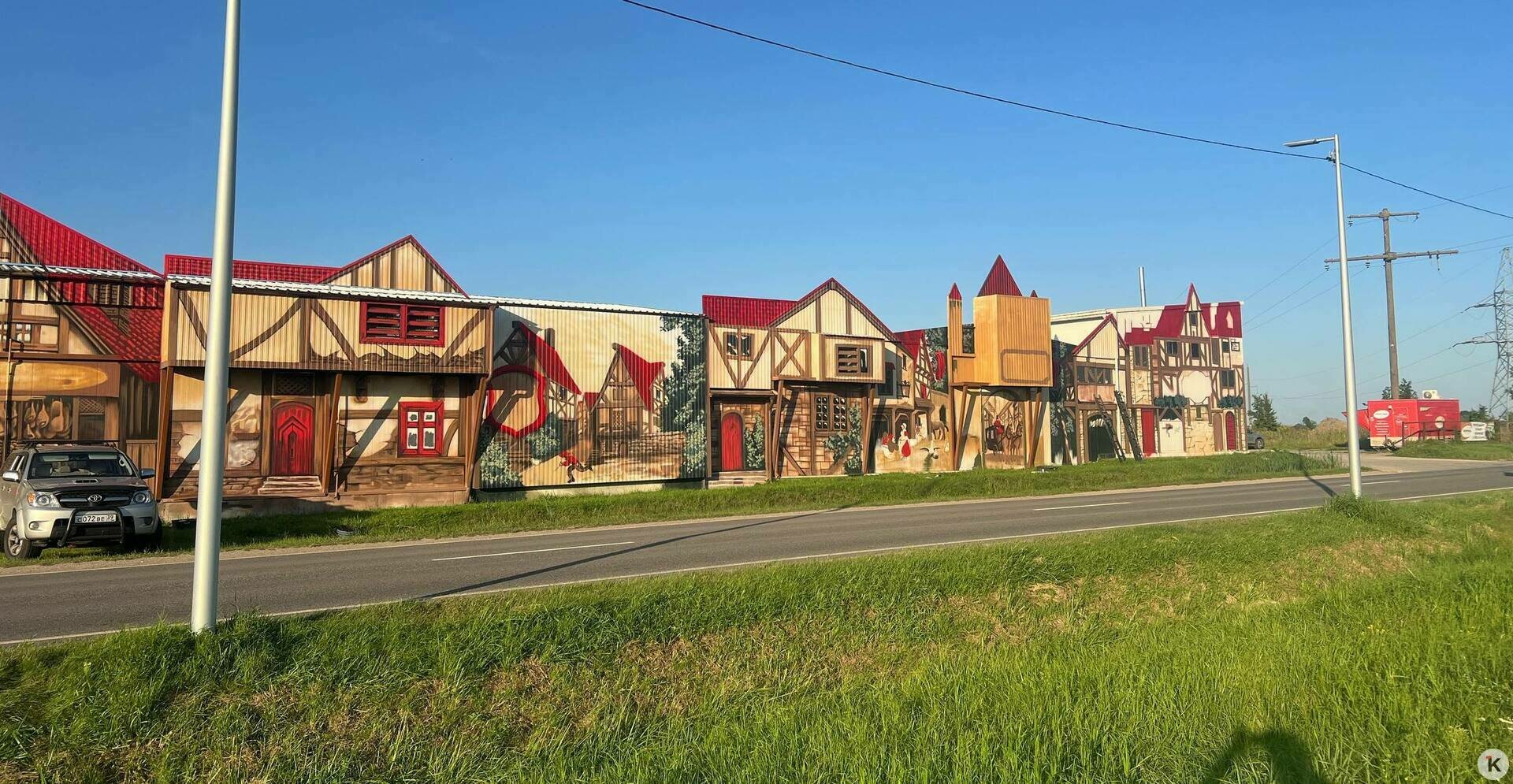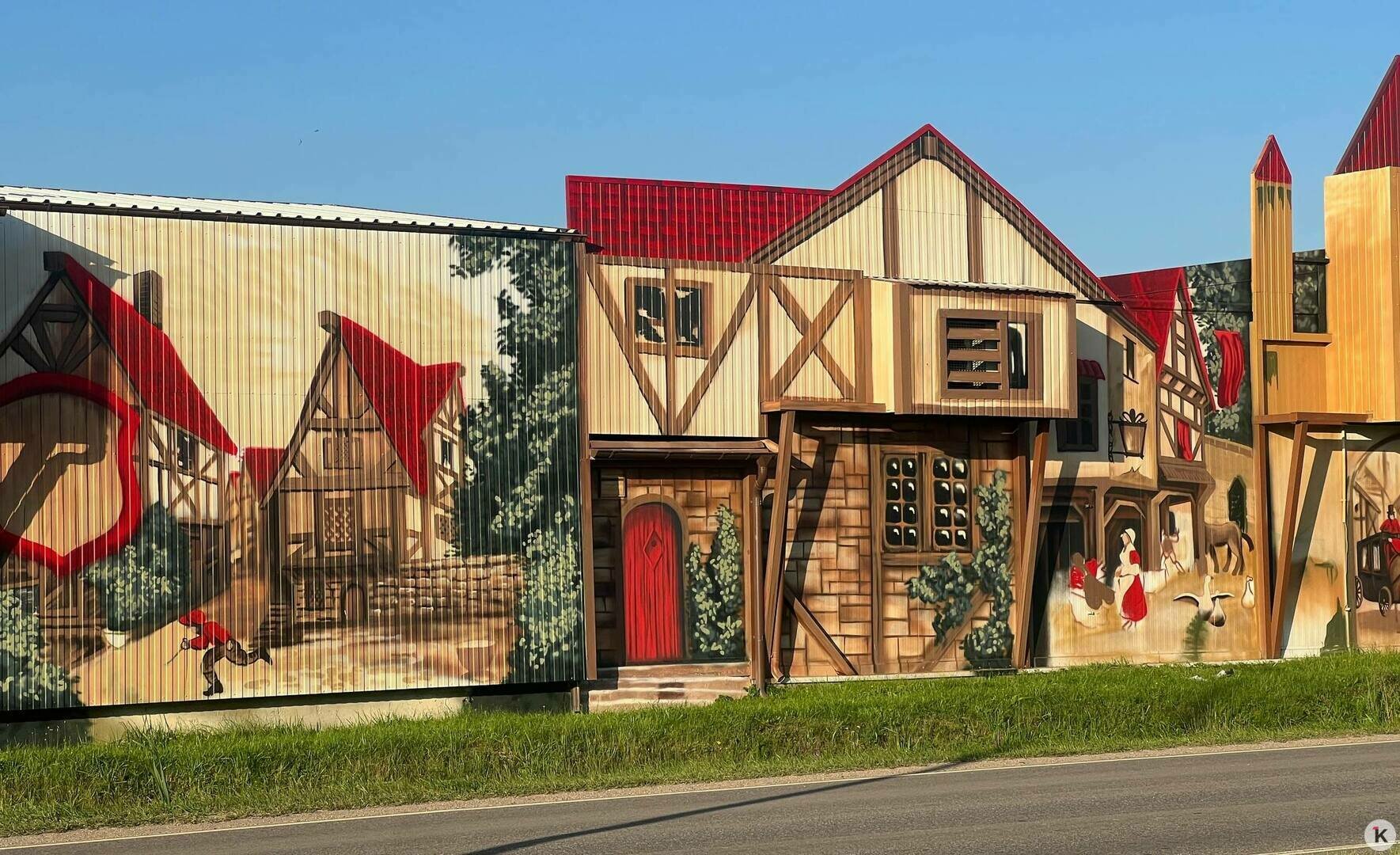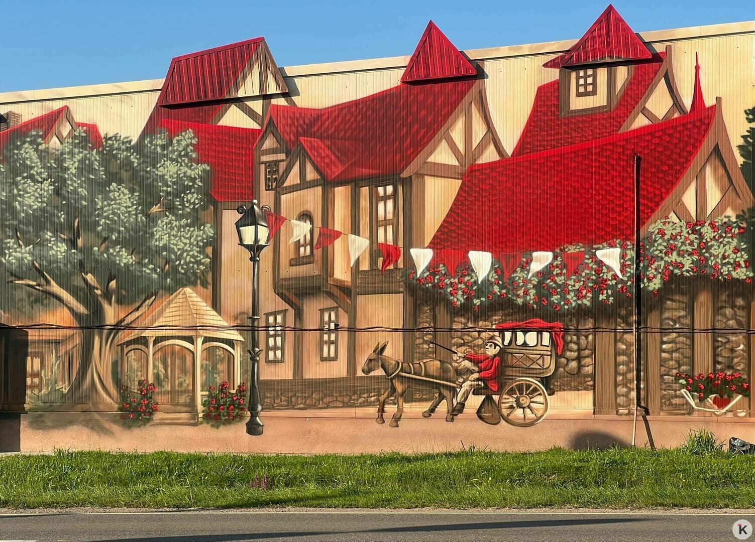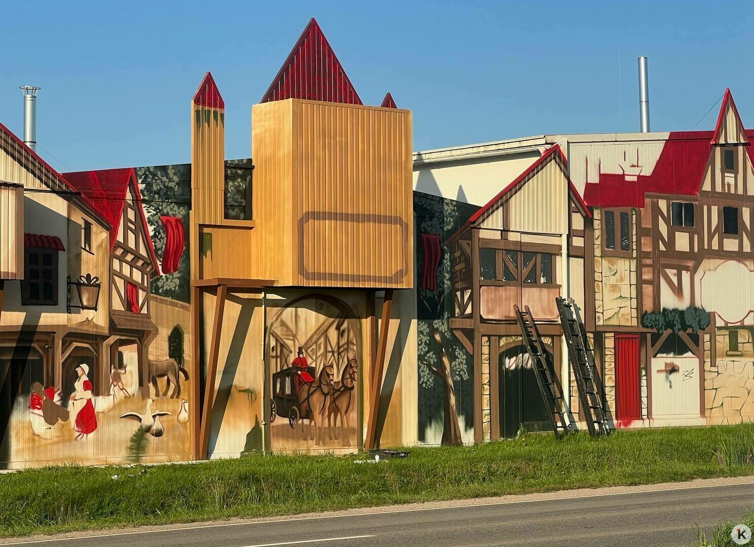 Кроме того, параллельно идёт работа ещё над четырьмя объектами. Самый крупный из них — комплекс мясокомбината в Поречье. Почти тысячу квадратных метров заводской стены занимает изображение сказочной деревеньки. Художнику удалось не просто спрятать под краской, но обыграть в рисунке все неровности и выпуклости, кондиционеры и лестницы.