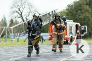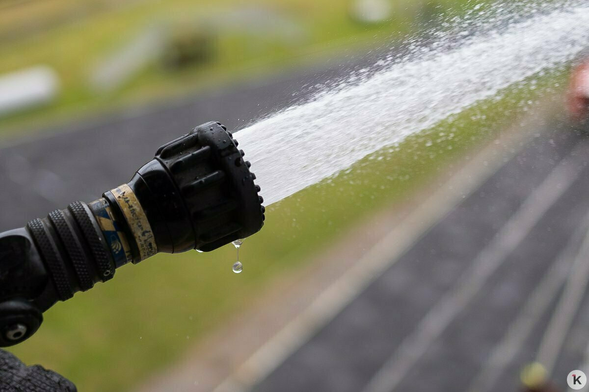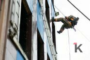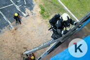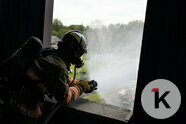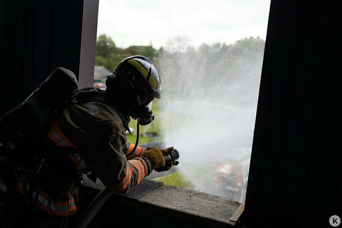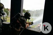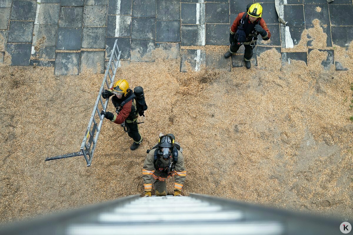Так что учебный четвёртый этаж штурмуют по-настоящему, и даже по-настоящему подают в рукав воду — правда, льётся она не внутрь «здания», а всё-таки наружу. Это не показательное выступление.