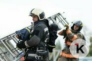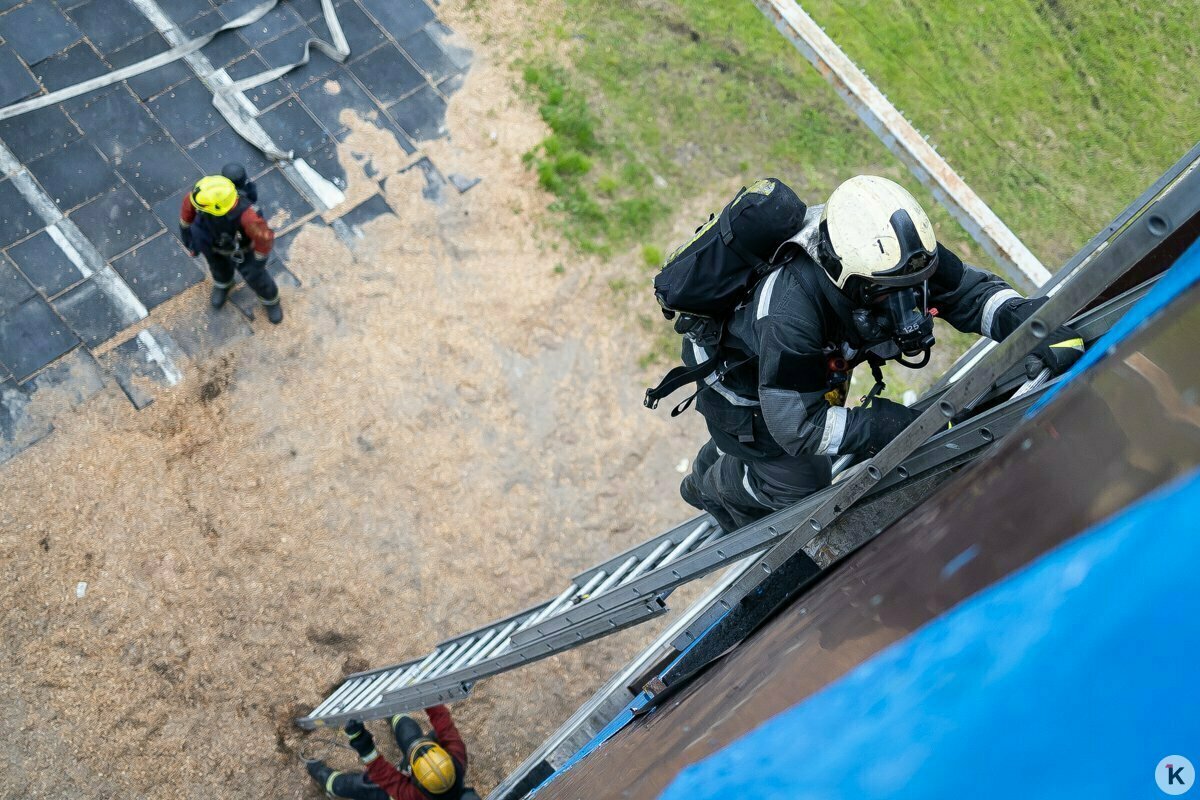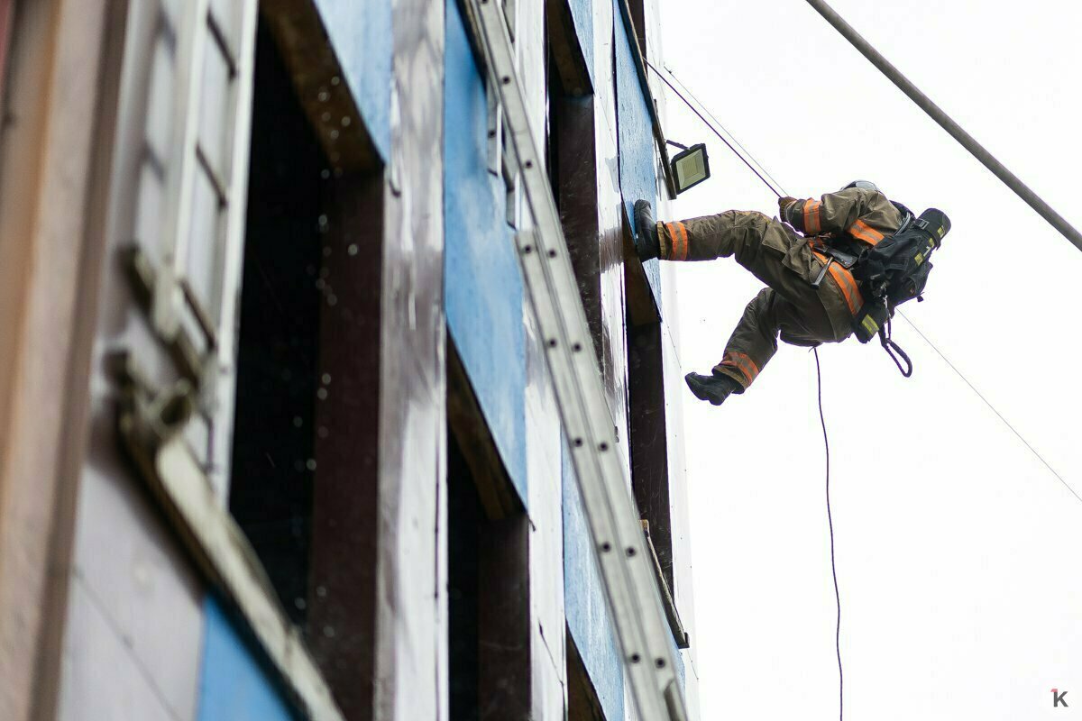 Первым, как обычно, идёт Роман — так положено командиру отделения. За ним поднимаются Артём и Андрей, Денис и водитель Сергей Николаевич разворачивают пожарные рукава и подают в них воду.
