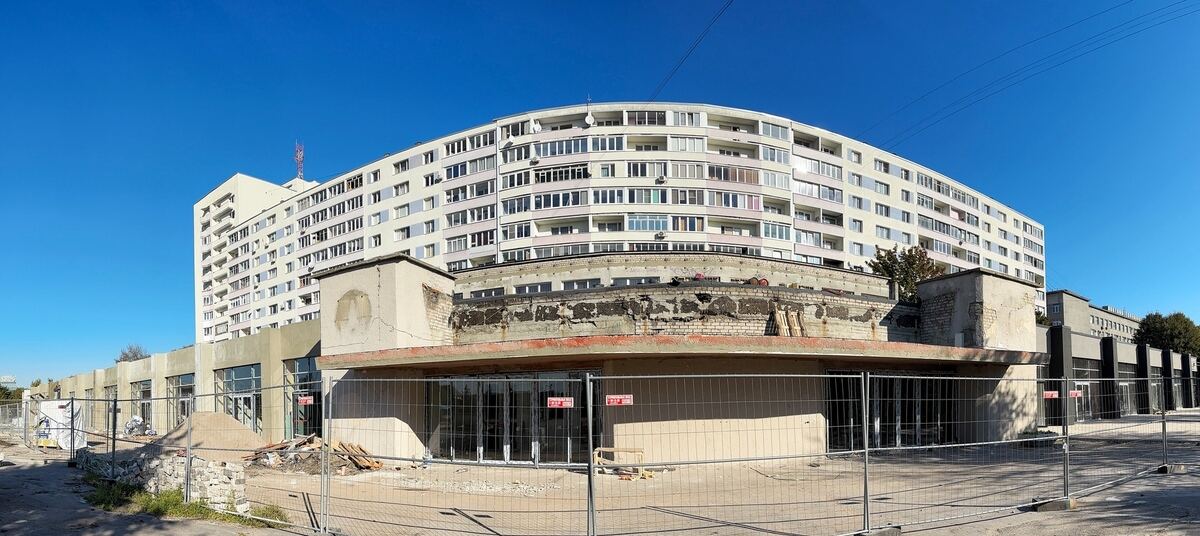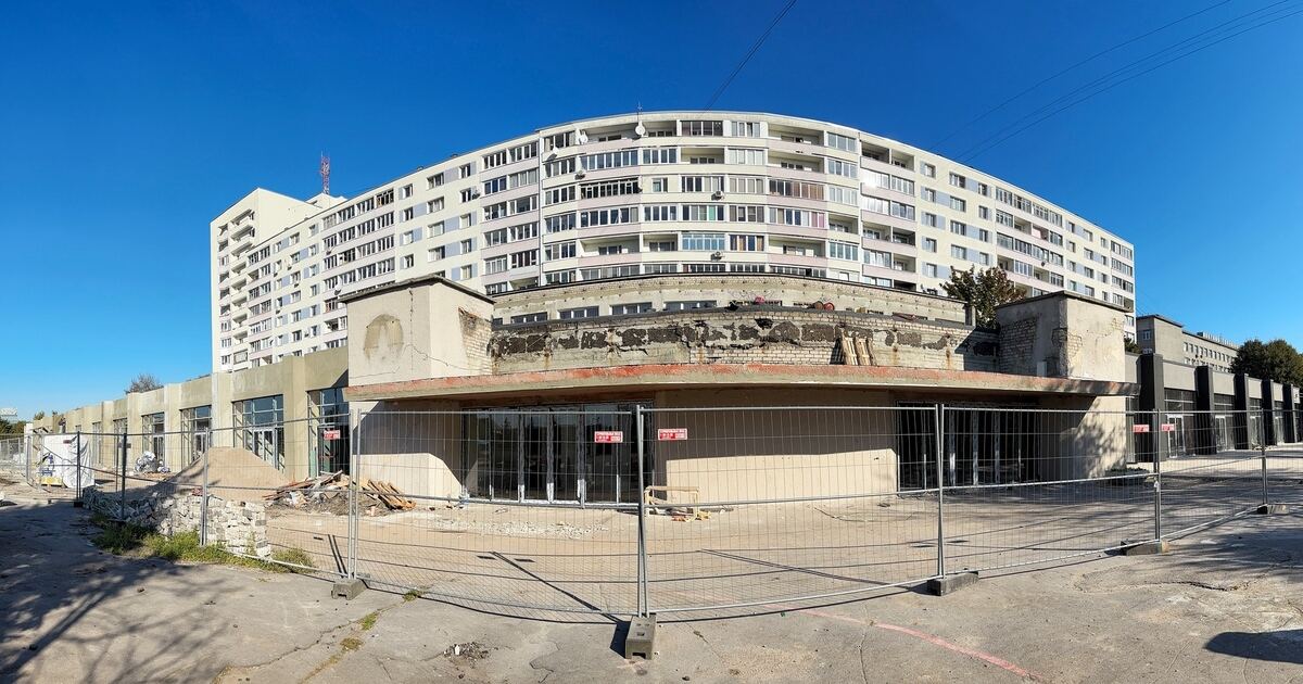 Там, где ранее располагались кафе, магазин для байкеров и сами торговые площади универсама — вставлены большие панорамные стёкла и ведётся внутренняя отделка. Строители также укладывают бетонную плитку вокруг магазина.