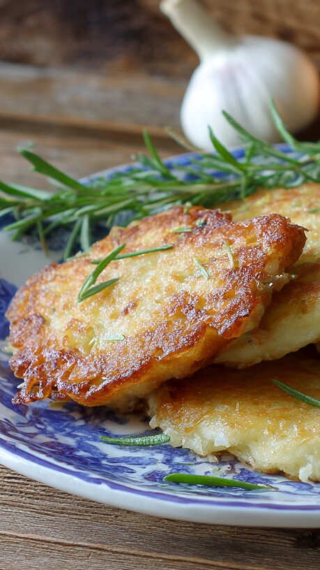 Половину очищенного картофеля измельчить на мелкой тёрке и смешать с чайной ложкой розмарина. Оставшийся картофель пропустить через крупную тёрку и соединить с первой частью. Лук превратить в кашицу на мелкой тёрке и добавить к картофельной массе. Приправить солью, перцем, кориандром и базиликом.Всыпать муку и тщательно перемешать.