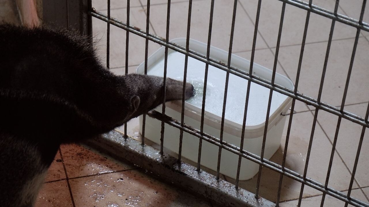 Вёдра с водой, которую меняют 2-3 раза в день, для животных ставят за решёткой специально. Звери любят распускать когти, ведь в природе они добывают влагу, разрывая плоды пальмового дерева. Чтобы ту же учесть не разделила поилка, а её осколки не поранили муравьеда, ведро ставят вплотную к решётке. В таком положении дотянуться до искусственного водоёма может только 60-сантиметровый язык, а не лапы.