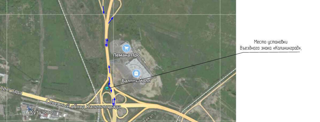Въездной знак с подсветкой высотой в 25,2 метра планируют установить в районе транспортной развязки на Зеленоградск. Установить знак планируют на земельном участке с кадастровым номером 39:03:040034:841. Площадь застройки сооружения — 74,43 кв. метра.
