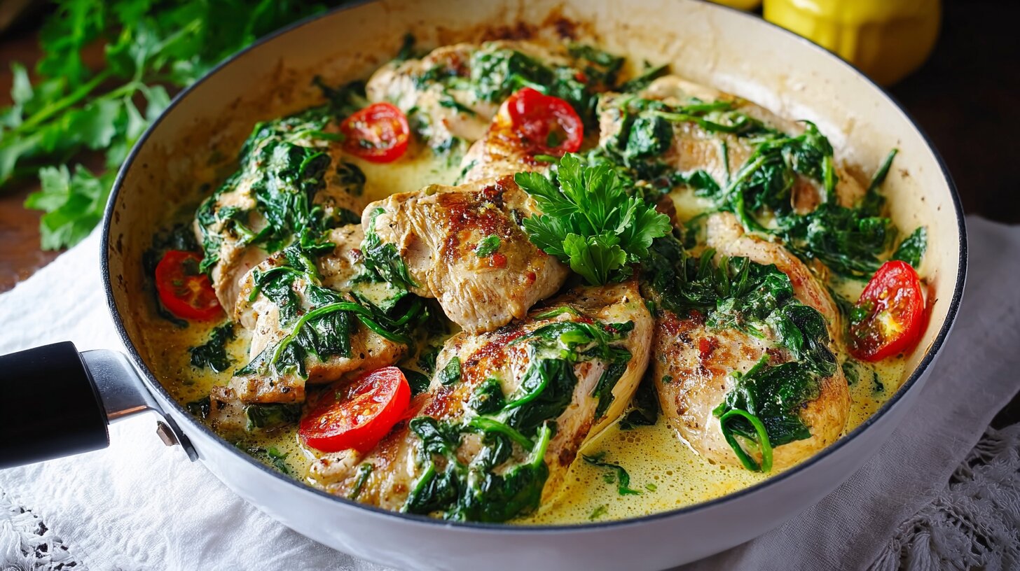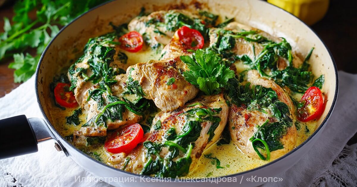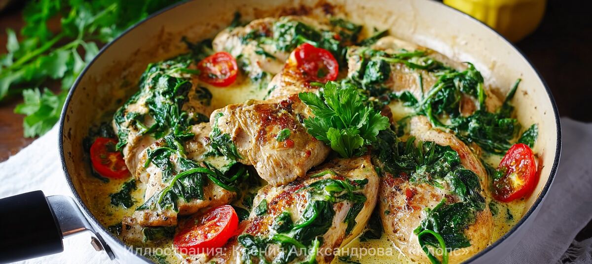 Куриное филе нарезать небольшими кусочками. Разогреть в сковороде масло и обжарить курицу до легкой румяной корочки. Убавить огонь. Добавить к птице шпинат: если используется свежий — предварительно мелко нарезать. Закрыть крышкой и тушить 3 минуты.