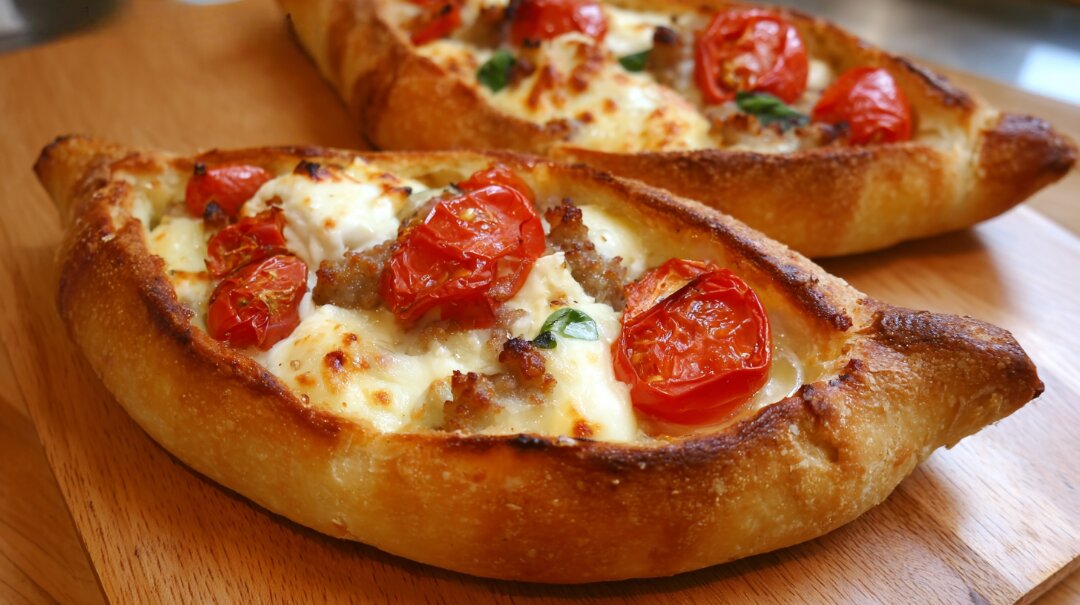 Для начинки нарезать черри и моцареллу, твёрдый сыр натереть. Достать лодочки из духовки, наполнить их сыром, помидорами и моцареллой. Вернуть в духовку ещё на 5-10 минут, при желании включив режим гриля в конце приготовления.