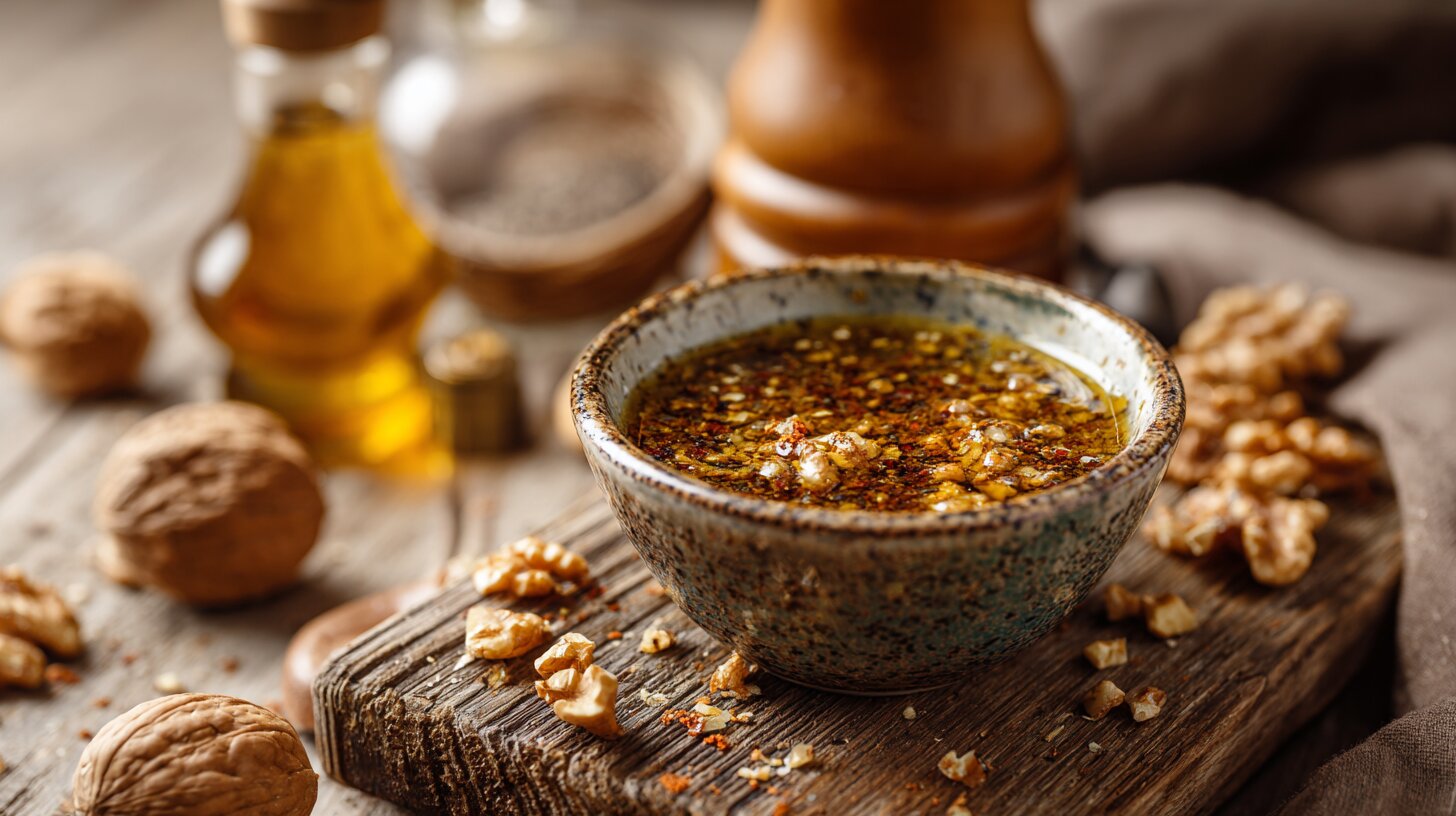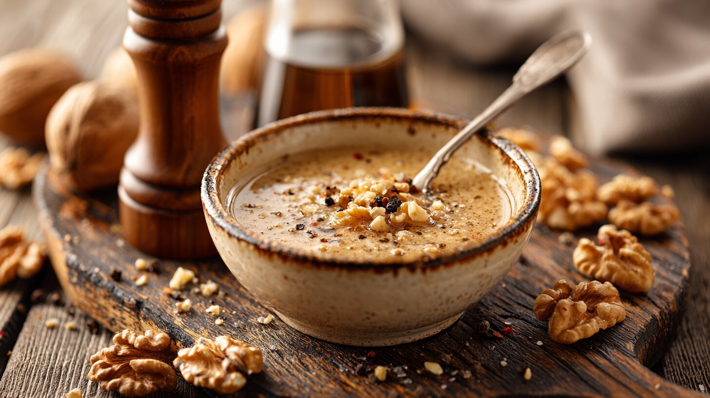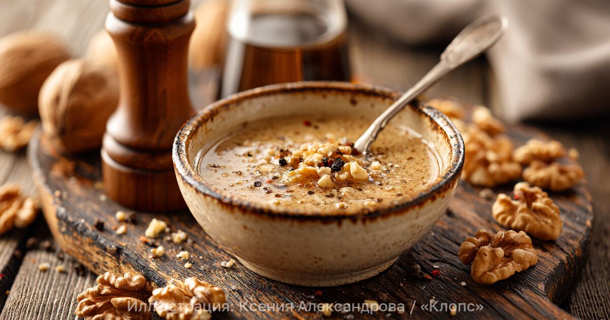 Грецкие орехи измельчить в блендере или кофемолке до состояния мелкой крошки. В глубокой миске смешать уксус, растительное масло, сахар и соль. Добавить молотые орехи и черный перец. Тщательно взбить венчиком до однородной консистенции.