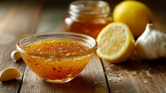 Чеснок очистить и пропустить через пресс. Взбить венчиком растительное масло с лимонным соком до однородной эмульсии. Добавить мёд, чеснок, соль и красный перец. Тщательно перемешать до полного соединения ингредиентов.