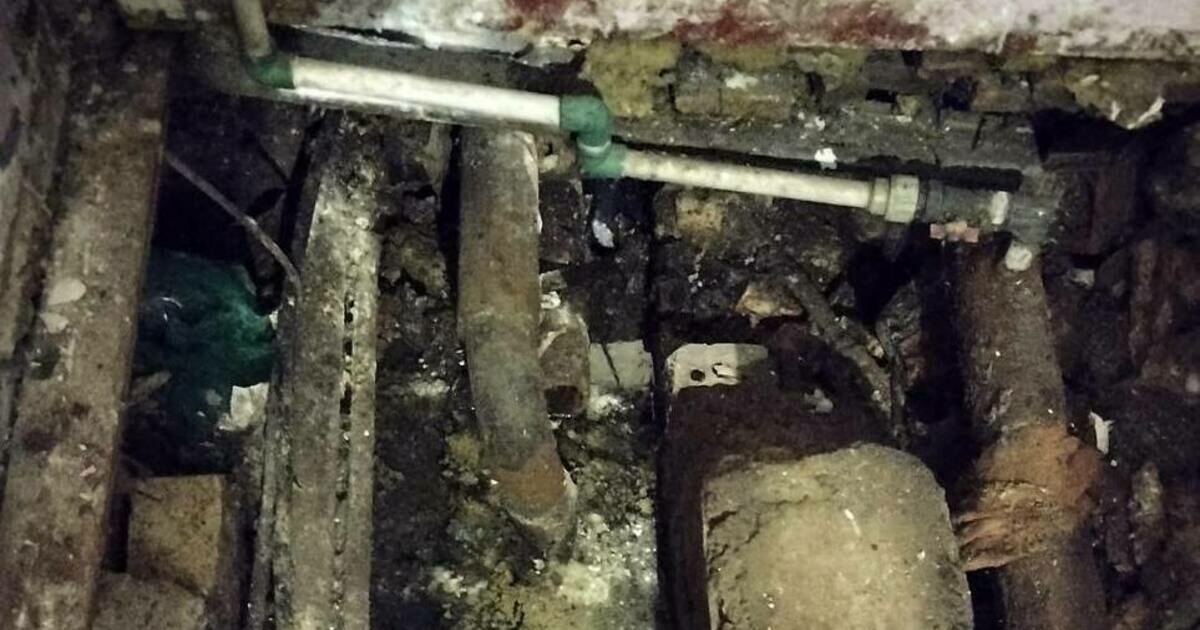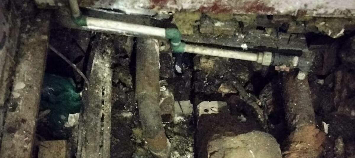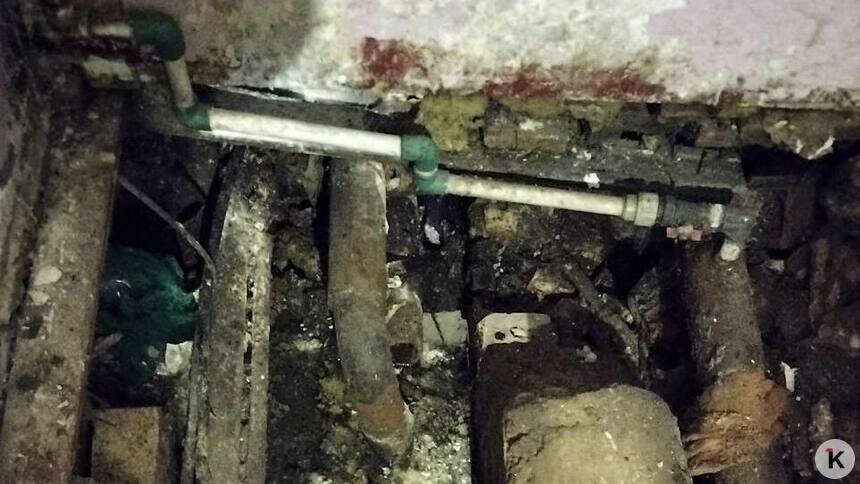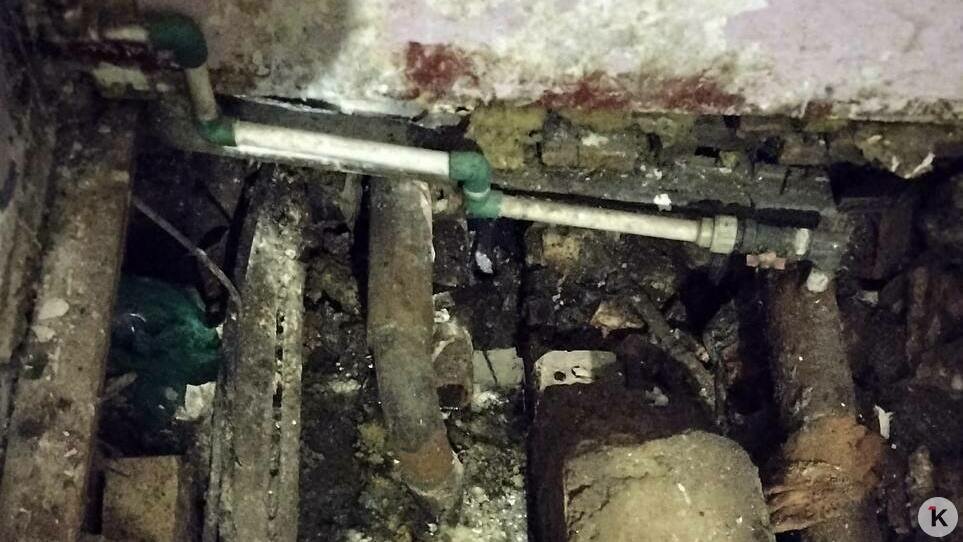 По словам представителя УК, в здании нет полноценного подвала, и все трубы проходят в техподполье рядом друг с другом. Прошлый отопительный сезон труба отопления кое-как выдержала, но к новому разрушилась «до состояния крошки». Сети гниют, потому что помещение почти постоянно затоплено фекальной жижей.