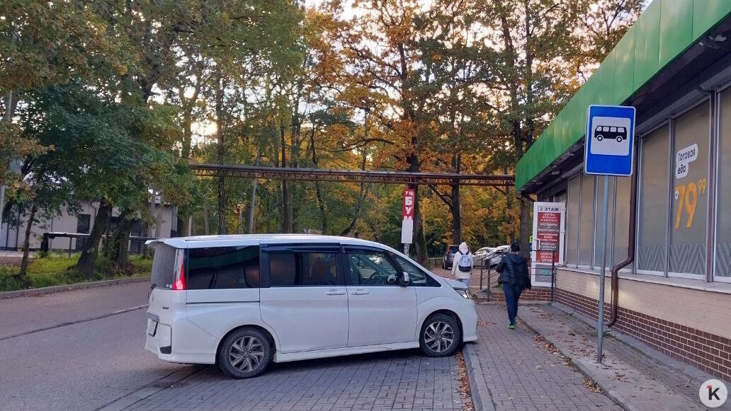 На Докука остановку обустроили прямо на парковке. Знак воткнули именно там, где останавливаются посетители магазина. К сожалению, такое в Калининграде случается всё чаще. Аналогичным образом организована остановка на Новгородской, но там хотя бы сделан павильон.