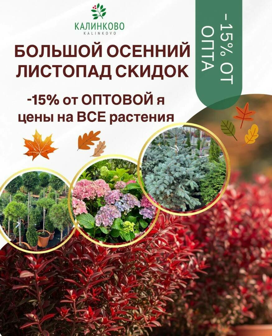 И в нашем питомнике «Калинково» начался «большой осенний листопад скидок»! Листья кружатся, а цены на саженцы — летят вниз.