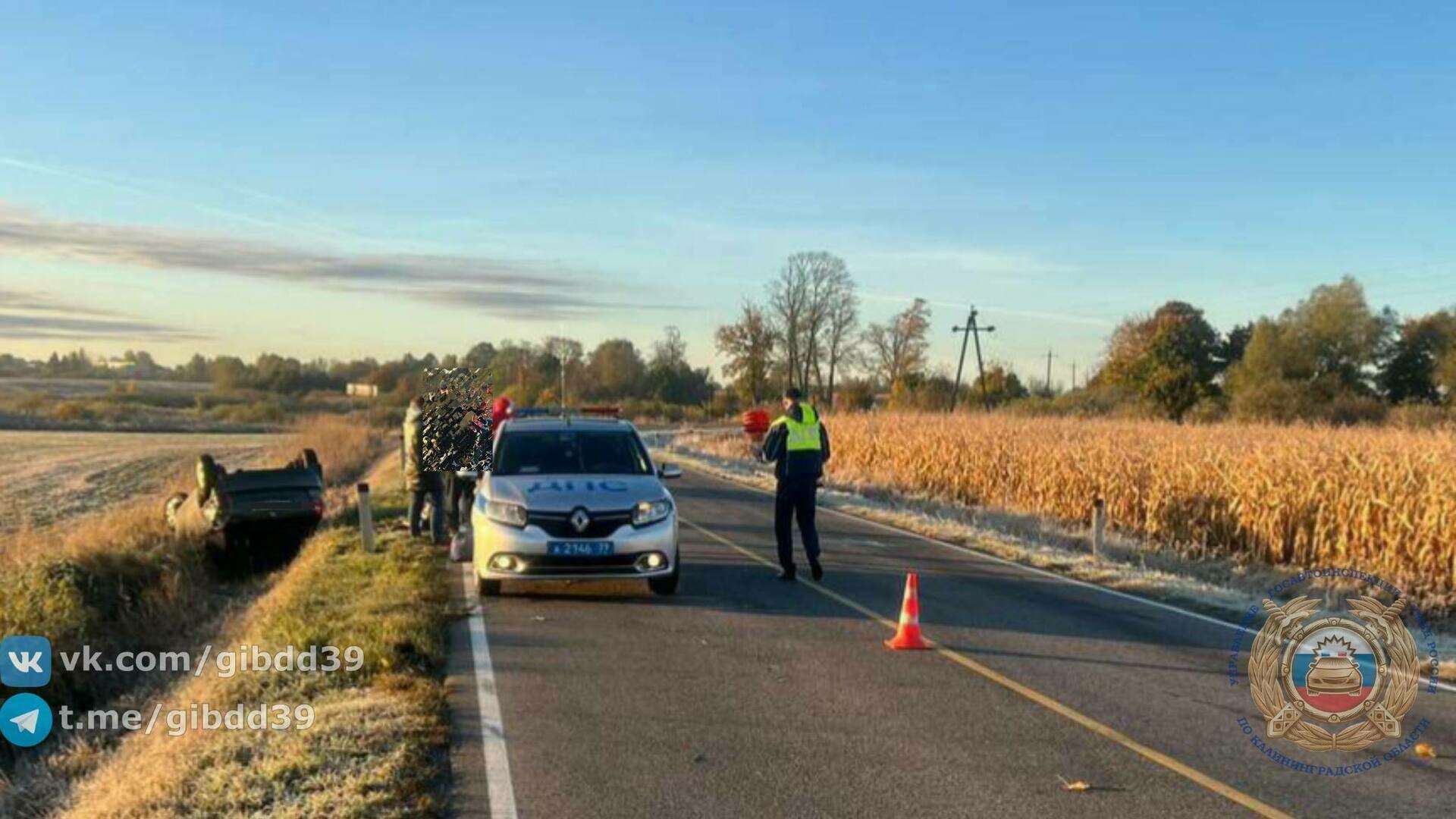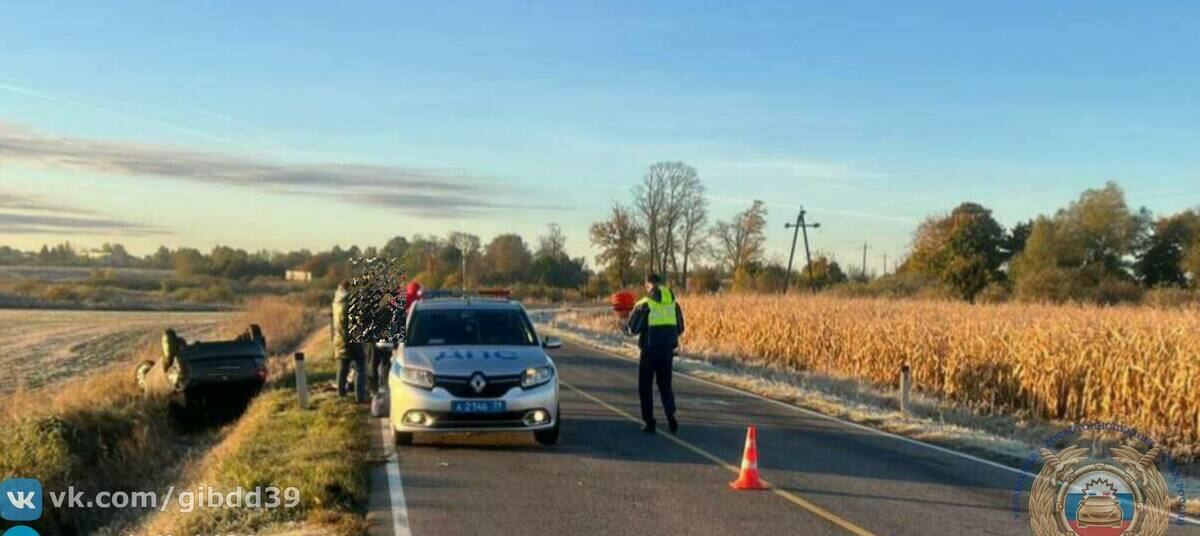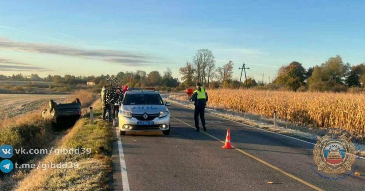 ДТП произошло в понедельник, 20 октября, около 7:15, на трассе пос. Добровольск — граница с Республикой Польша. Водитель 1981 года рождения «на левостороннем закруглении съехала в кювет с опрокидыванием». Сидевшая за рулём женщина получила травмы.